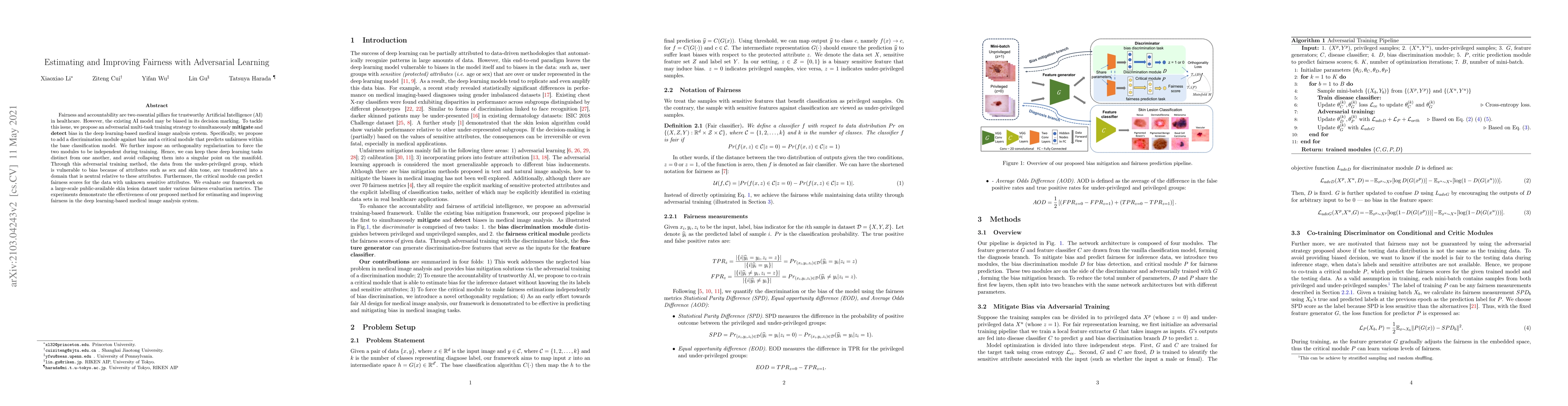 Fairness and accountability are two essential pillars for trustworthy Artificial Intelligence (AI) in healthcare. However, the existing AI model may be biased in its decision marking. To tackle this issue, we propose an adversarial multi-task training strategy to simultaneously mitigate and detect bias in the deep learning-based medical image analysis system. Specifically, we propose to add a discrimination module against bias and a critical module that predicts unfairness within the base classification model. We further impose an orthogonality regularization to force the two modules to be independent during training. Hence, we can keep these deep learning tasks distinct from one another, and avoid collapsing them into a singular point on the manifold. Through this adversarial training method, the data from the underprivileged group, which is vulnerable to bias because of attributes such as sex and skin tone, are transferred into a domain that is neutral relative to these attributes. Furthermore, the critical module can predict fairness scores for the data with unknown sensitive attributes. We evaluate our framework on a large-scale public-available skin lesion dataset under various fairness evaluation metrics. The experiments demonstrate the effectiveness of our proposed method for estimating and improving fairness in the deep learning-based medical image analysis system.