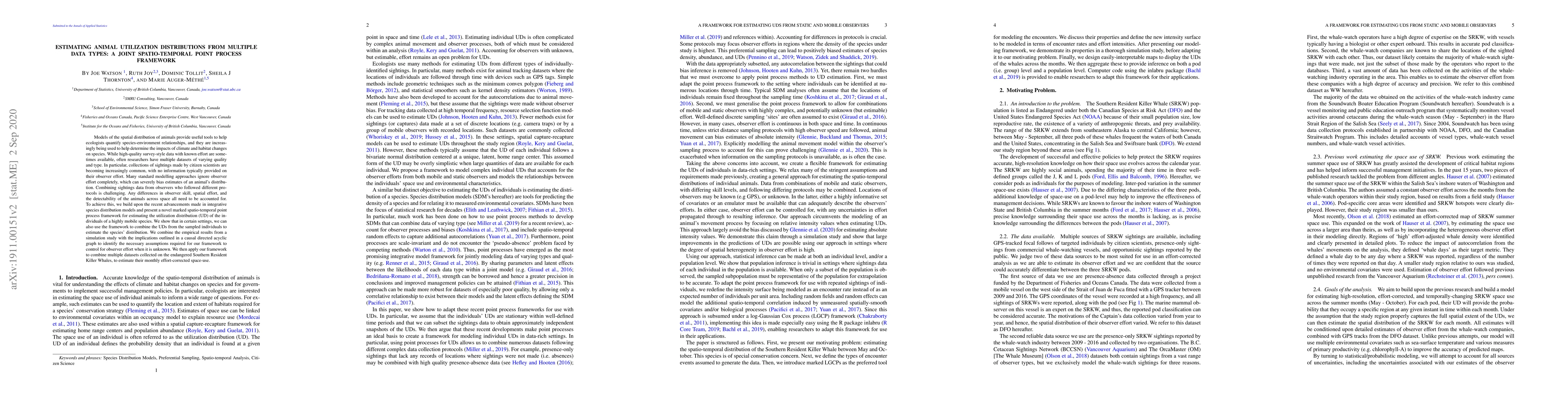 Models of the spatial distribution of animals provide useful tools to help ecologists quantify species-environment relationships, and they are increasingly being used to help determine the impacts of climate and habitat changes on species. While high-quality survey-style data with known effort are sometimes available, often researchers have multiple datasets of varying quality and type. In particular, collections of sightings made by citizen scientists are becoming increasingly common, with no information typically provided on their observer effort. Many standard modelling approaches ignore observer effort completely, which can severely bias estimates of an animal's distribution. Combining sightings data from observers who followed different protocols is challenging. Any differences in observer skill, spatial effort, and the detectability of the animals across space all need to be accounted for. To achieve this, we build upon the recent advancements made in integrative species distribution models and present a novel marked spatio-temporal point process framework for estimating the utilization distribution (UD) of the individuals of a highly mobile species. We show that in certain settings, we can also use the framework to combine the UDs from the sampled individuals to estimate the species' distribution. We combine the empirical results from a simulation study with the implications outlined in a causal directed acyclic graph to identify the necessary assumptions required for our framework to control for observer effort when it is unknown. We then apply our framework to combine multiple datasets collected on the endangered Southern Resident Killer Whales, to estimate their monthly effort-corrected space-use.