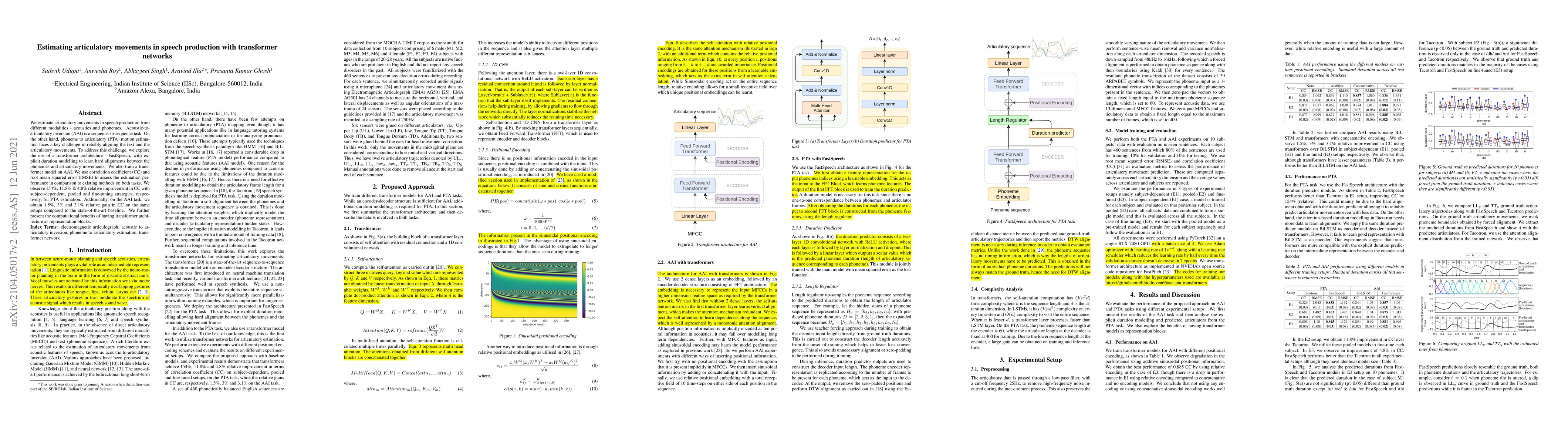We estimate articulatory movements in speech production from different modalities - acoustics and phonemes. Acoustic-to articulatory inversion (AAI) is a sequence-to-sequence task. On the other hand, phoneme to articulatory (PTA) motion estimation faces a key challenge in reliably aligning the text and the articulatory movements. To address this challenge, we explore the use of a transformer architecture - FastSpeech, with explicit duration modelling to learn hard alignments between the phonemes and articulatory movements. We also train a transformer model on AAI. We use correlation coefficient (CC) and root mean squared error (rMSE) to assess the estimation performance in comparison to existing methods on both tasks. We observe 154%, 11.8% & 4.8% relative improvement in CC with subject-dependent, pooled and fine-tuning strategies, respectively, for PTA estimation. Additionally, on the AAI task, we obtain 1.5%, 3% and 3.1% relative gain in CC on the same setups compared to the state-of-the-art baseline. We further present the computational benefits of having transformer architecture as representation blocks.