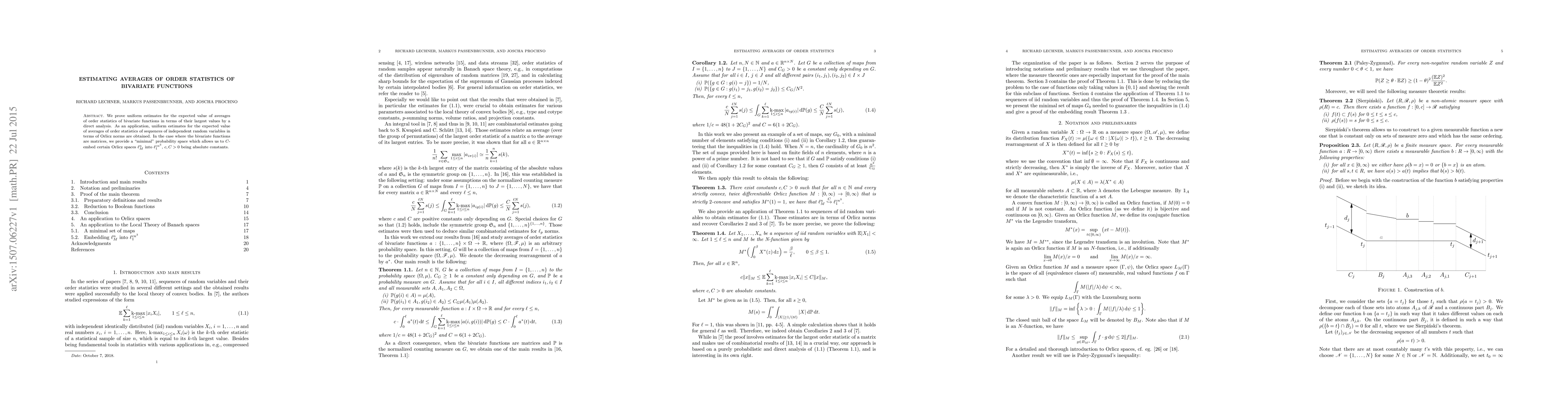 This paper establishes uniform estimates for the expected value of averages of order statistics of bivariate functions, linking them to their largest values through direct analysis. It also provides a minimal probability space for embedding certain Orlicz spaces into $\ell_1$ spaces, with applications to sequences of independent random variables.