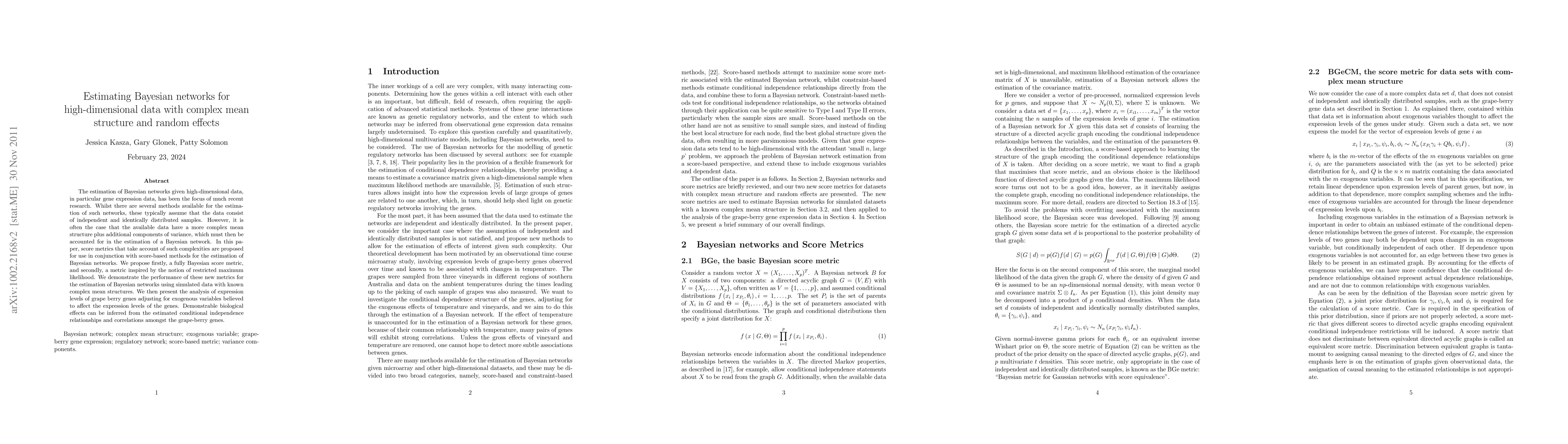 The estimation of Bayesian networks given high-dimensional data, in particular gene expression data, has been the focus of much recent research. Whilst there are several methods available for the estimation of such networks, these typically assume that the data consist of independent and identically distributed samples. However, it is often the case that the available data have a more complex mean structure plus additional components of variance, which must then be accounted for in the estimation of a Bayesian network. In this paper, score metrics that take account of such complexities are proposed for use in conjunction with score-based methods for the estimation of Bayesian networks. We propose firstly, a fully Bayesian score metric, and secondly, a metric inspired by the notion of restricted maximum likelihood. We demonstrate the performance of these new metrics for the estimation of Bayesian networks using simulated data with known complex mean structures. We then present the analysis of expression levels of grape berry genes adjusting for exogenous variables believed to affect the expression levels of the genes. Demonstrable biological effects can be inferred from the estimated conditional independence relationships and correlations amongst the grape-berry genes.