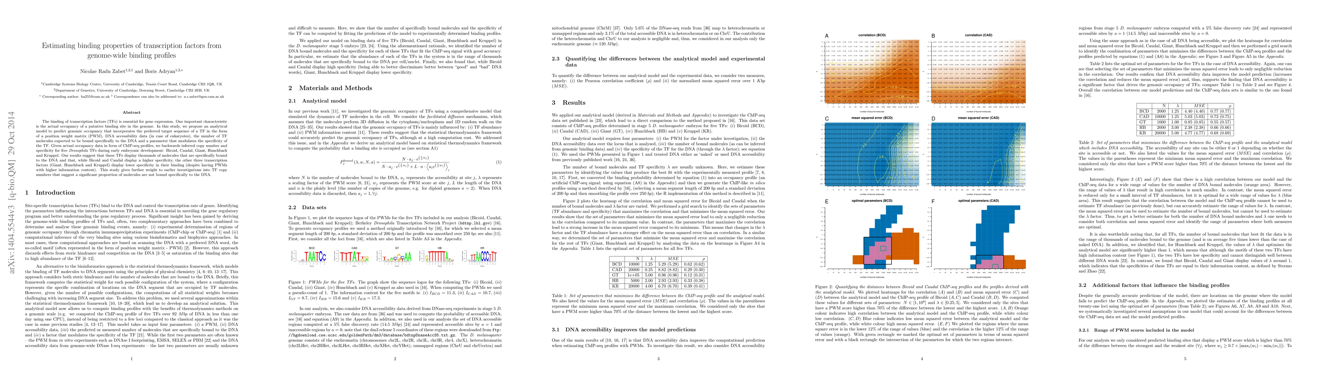 This study proposes an analytical model to predict transcription factor genomic occupancy using a position weight matrix, DNA accessibility data, and specificity parameters. It infers copy number and specificity for five Drosophila TFs from ChIP-seq data, revealing that while Bicoid and Caudal show higher specificity, Giant, Hunchback, and Kruppel bind with lower specificity despite higher PWM information content.