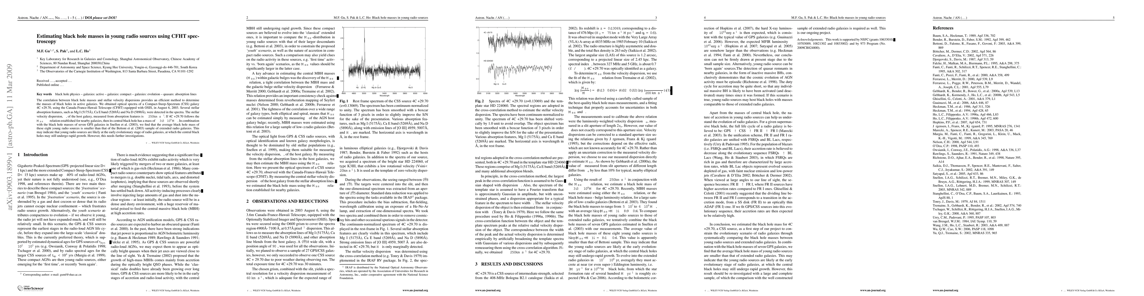 This study estimates the mass of a black hole in the young radio source 4C +29.70 using CFHT spectroscopy, finding a mass of approximately $3.3 \times 10^{8}M_{\odot}$ based on stellar velocity dispersion. The research suggests young radio sources may be in an early evolutionary stage with rapidly growing black holes, though further study is needed.