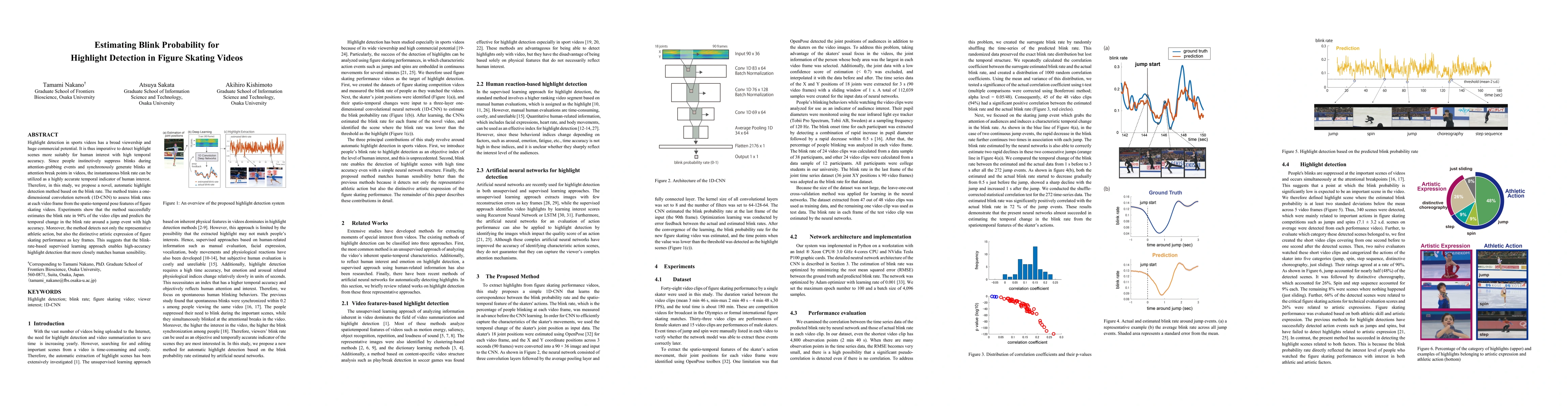 This study proposes a novel method for detecting highlight scenes in figure skating videos using blink rate estimation. It employs a 1D-CNN to analyze spatio-temporal pose features, achieving 94% accuracy in estimating blink rates and successfully identifying key frames that reflect both athletic actions and artistic expressions.