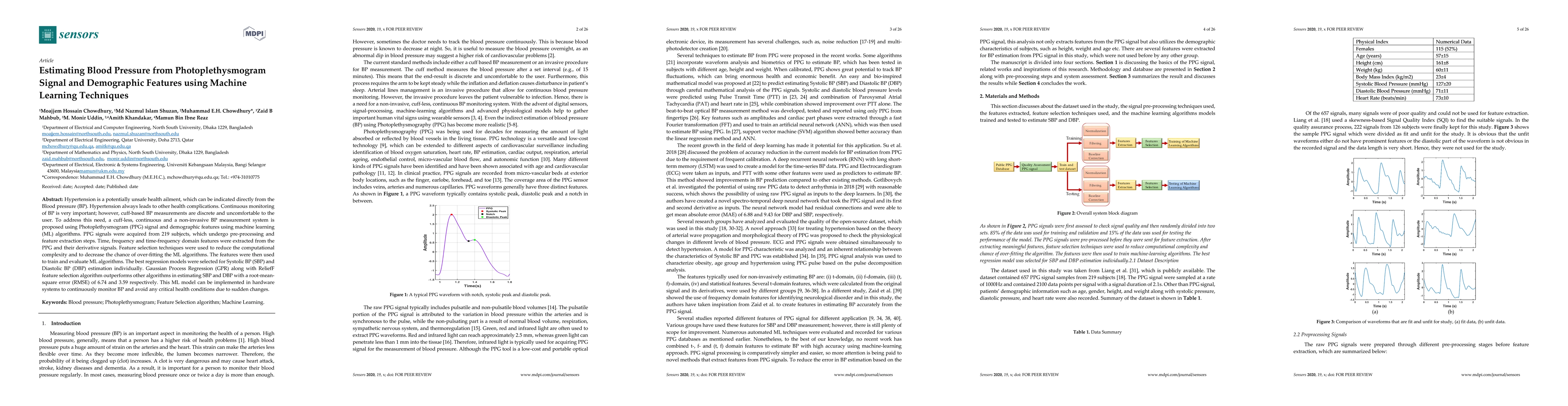 This paper proposes a cuff-less, continuous, and non-invasive blood pressure monitoring system using Photoplethysmogram (PPG) signals and demographic features with machine learning techniques. The Gaussian Process Regression (GPR) model, enhanced by ReliefF feature selection, achieves the best performance in estimating Systolic and Diastolic BP with RMSE values of 6.74 mmHg and 3.59 mmHg, respectively.