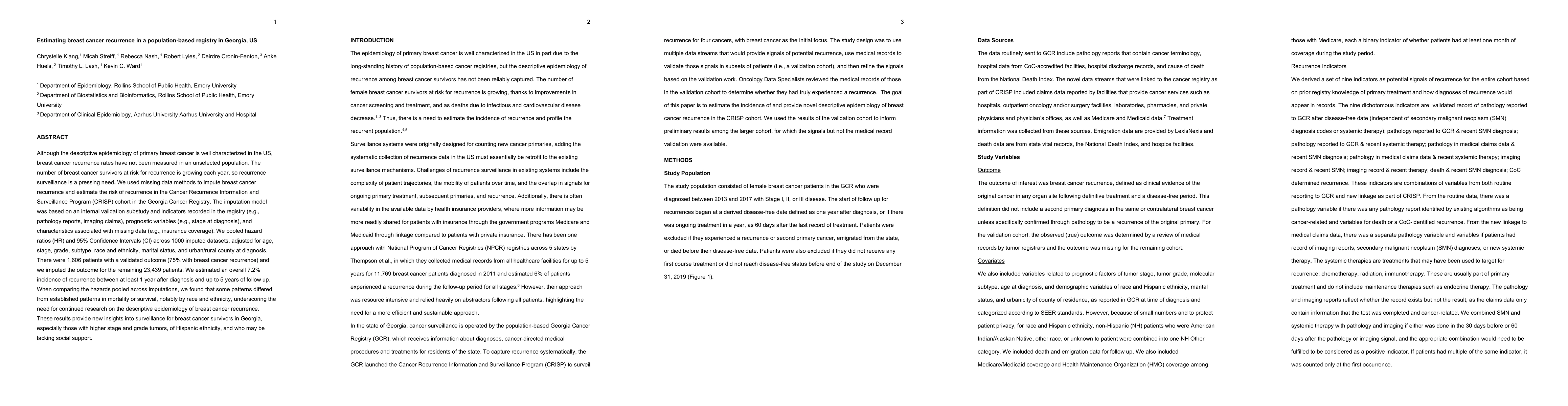 Although the descriptive epidemiology of primary breast cancer is well characterized in the US, breast cancer recurrence rates have not been measured in an unselected population. The number of breast cancer survivors at risk for recurrence is growing each year, so recurrence surveillance is a pressing need. We used missing data methods to impute breast cancer recurrence and estimate the risk of recurrence in the Cancer Recurrence Information and Surveillance Program (CRISP) cohort in the Georgia Cancer Registry. The imputation model was based on an internal validation substudy and indicators recorded in the registry (e.g., pathology reports, imaging claims), prognostic variables (e.g., stage at diagnosis), and characteristics associated with missing data (e.g., insurance coverage). We pooled hazard ratios (HR) and 95% Confidence Intervals (CI) across 1000 imputed datasets, adjusted for age, stage, grade, subtype, race and ethnicity, marital status, and urban/rural county at diagnosis. There were 1,606 patients with a validated outcome (75% with breast cancer recurrence) and we imputed the outcome for the remaining 23,439 patients. We estimated an overall 7.2% incidence of recurrence between at least 1 year after diagnosis and up to 5 years of follow up. When comparing the hazards pooled across imputations, we found that some patterns differed from established patterns in mortality or survival, notably by race and ethnicity, underscoring the need for continued research on the descriptive epidemiology of breast cancer recurrence. These results provide new insights into surveillance for breast cancer survivors in Georgia, especially those with higher stage and grade tumors, of Hispanic ethnicity, and who may be lacking social support.
