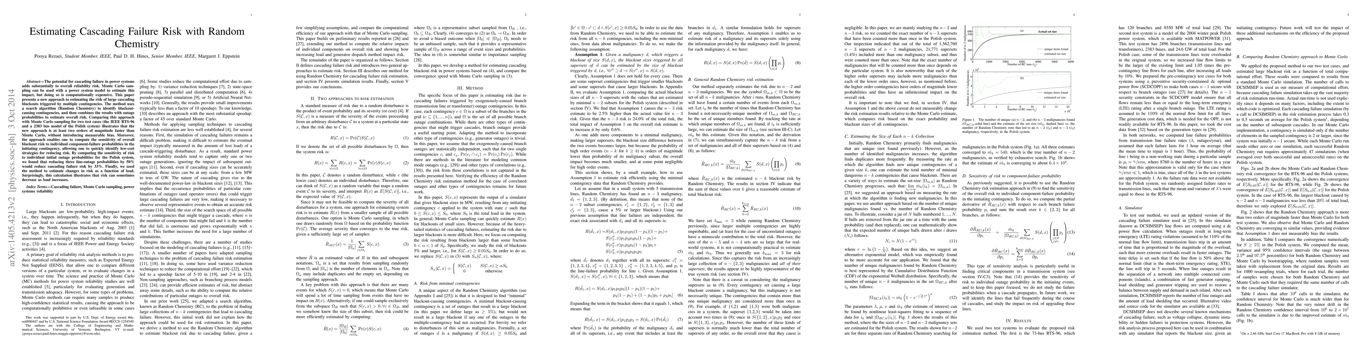 This paper introduces a novel "Random Chemistry" search algorithm to estimate the risk of cascading failures in power systems, which is significantly faster than Monte Carlo sampling without introducing bias. The method identifies blackout-causing contingencies and computes sensitivity to individual component failures, revealing that reducing certain line-outage probabilities can substantially lower risk.