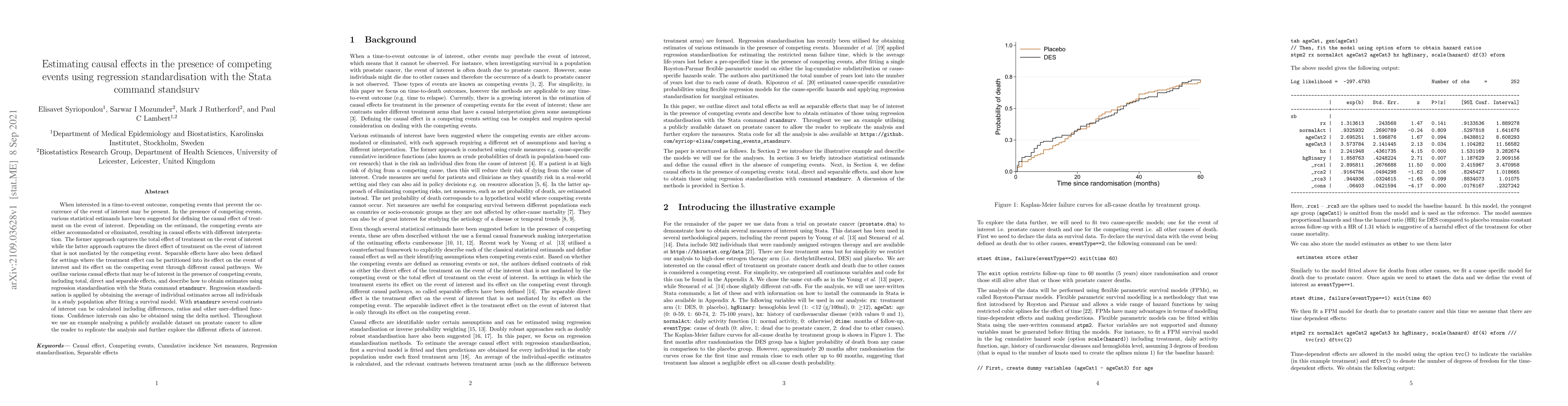 This paper discusses estimating causal effects in the presence of competing events using regression standardisation with the Stata command standsurv. It outlines various causal effects, including total, direct, and separable effects, and demonstrates their estimation using a publicly available prostate cancer dataset.