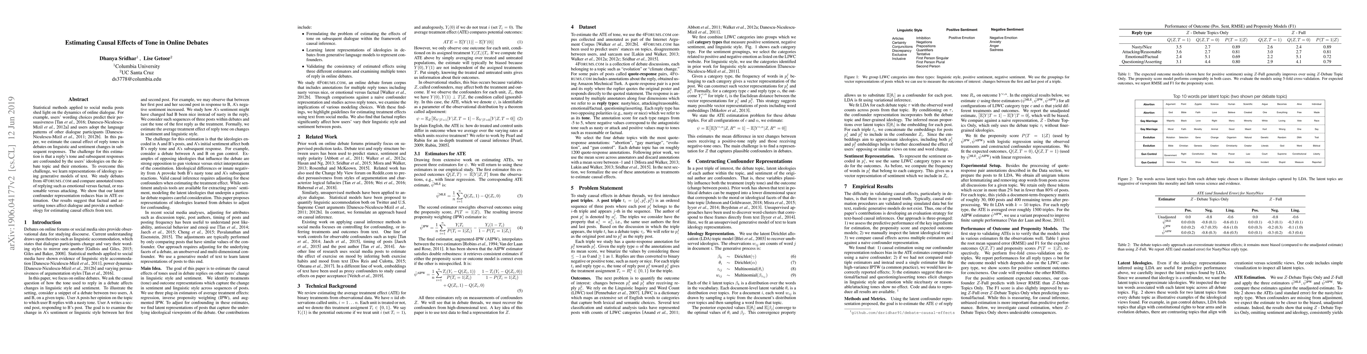 Statistical methods applied to social media posts shed light on the dynamics of online dialogue. For example, users' wording choices predict their persuasiveness and users adopt the language patterns of other dialogue participants. In this paper, we estimate the causal effect of reply tones in debates on linguistic and sentiment changes in subsequent responses. The challenge for this estimation is that a reply's tone and subsequent responses are confounded by the users' ideologies on the debate topic and their emotions. To overcome this challenge, we learn representations of ideology using generative models of text. We study debates from 4Forums and compare annotated tones of replying such as emotional versus factual, or reasonable versus attacking. We show that our latent confounder representation reduces bias in ATE estimation. Our results suggest that factual and asserting tones affect dialogue and provide a methodology for estimating causal effects from text.