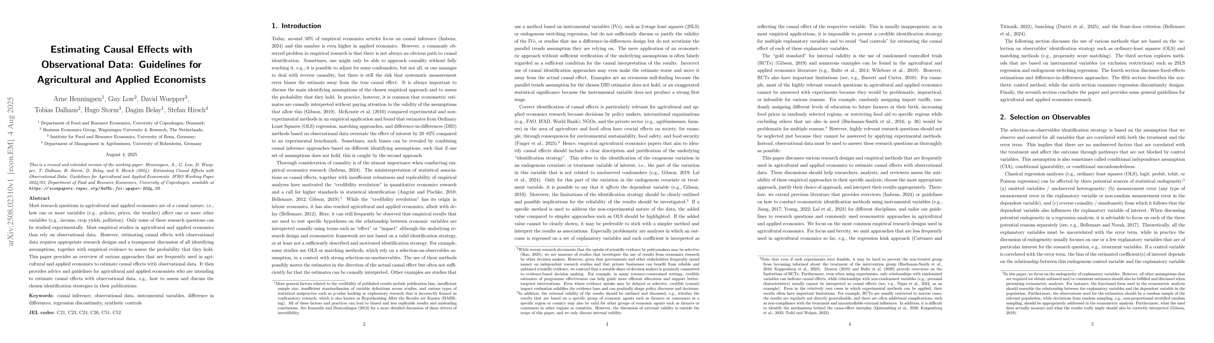 Most research questions in agricultural and applied economics are of a causal nature, i.e., how one or more variables (e.g., policies, prices, the weather) affect one or more other variables (e.g., income, crop yields, pollution). Only some of these research questions can be studied experimentally. Most empirical studies in agricultural and applied economics thus rely on observational data. However, estimating causal effects with observational data requires appropriate research designs and a transparent discussion of all identifying assumptions, together with empirical evidence to assess the probability that they hold. This paper provides an overview of various approaches that are frequently used in agricultural and applied economics to estimate causal effects with observational data. It then provides advice and guidelines for agricultural and applied economists who are intending to estimate causal effects with observational data, e.g., how to assess and discuss the chosen identification strategies in their publications.