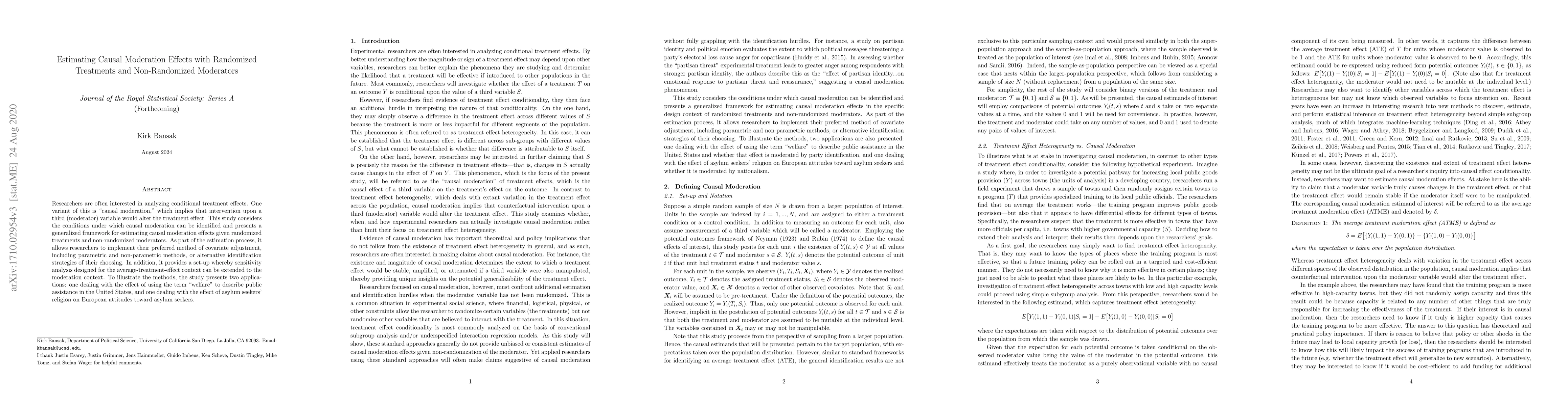Researchers are often interested in analyzing conditional treatment effects. One variant of this is "causal moderation," which implies that intervention upon a third (moderator) variable would alter the treatment effect. This study considers the conditions under which causal moderation can be identified and presents a generalized framework for estimating causal moderation effects given randomized treatments and non-randomized moderators. As part of the estimation process, it allows researchers to implement their preferred method of covariate adjustment, including parametric and non-parametric methods, or alternative identification strategies of their choosing. In addition, it provides a set-up whereby sensitivity analysis designed for the average-treatment-effect context can be extended to the moderation context. To illustrate the methods, the study presents two applications: one dealing with the effect of using the term "welfare" to describe public assistance in the United States, and one dealing with the effect of asylum seekers' religion on European attitudes toward asylum seekers.