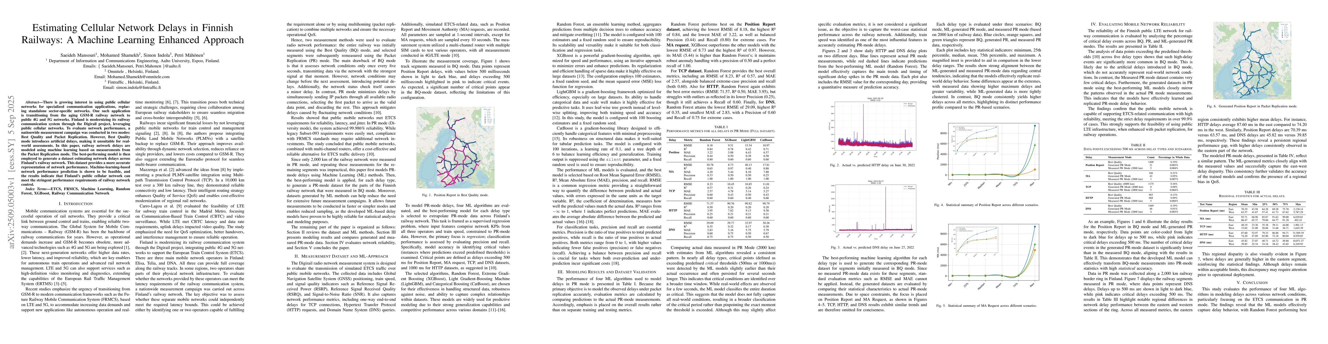 There is growing interest in using public cellular networks for specialized communication applications, replacing standalone sector-specific networks. One such application is transitioning from the aging GSM-R railway network to public 4G and 5G networks. Finland is modernizing its railway communication system through the Digirail project, leveraging public cellular networks. To evaluate network performance, a nationwide measurement campaign was conducted in two modes: Best Quality and Packet Replication. However, Best Quality mode introduces artificial delays, making it unsuitable for real-world assessments. In this paper, railway network delays are modeled using machine learning based on measurements from the Packet Replication mode. The best-performing model is then employed to generate a dataset estimating network delays across Finland's railway network. This dataset provides a more accurate representation of network performance. Machine learning based network performance prediction is shown to be feasible, and the results indicate that Finland's public cellular network can meet the stringent performance requirements of railway network control.