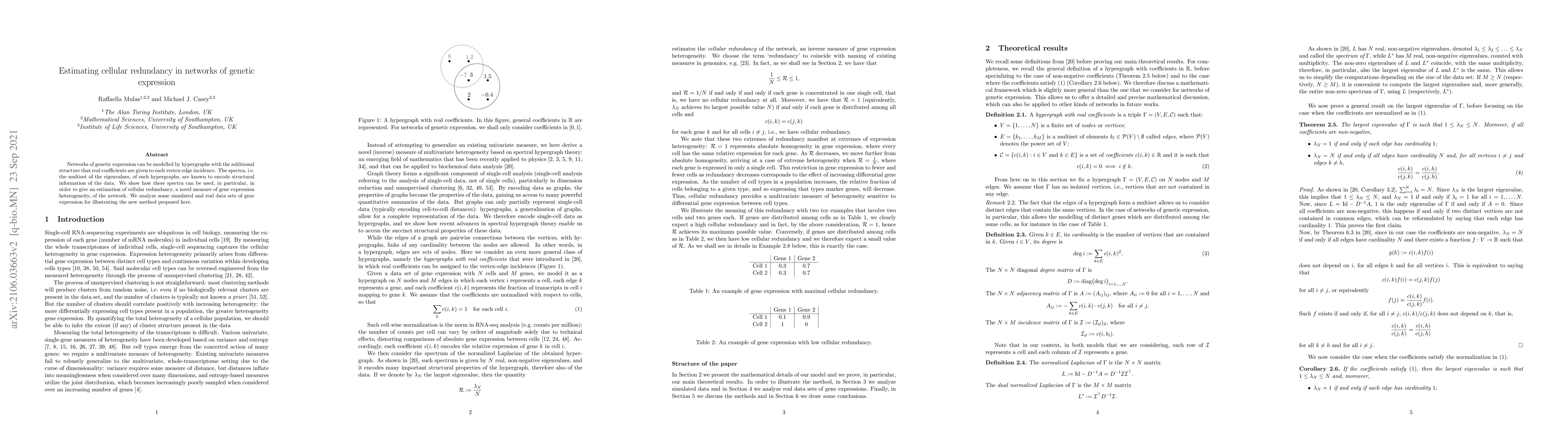 Networks of genetic expression can be modelled by hypergraphs with the additional structure that real coefficients are given to each vertex-edge incidence. The spectra, i.e. the multiset of the eigenvalues, of such hypergraphs, are known to encode structural information of the data. We show how these spectra can be used, in particular, in order to give an estimation of cellular redundancy, a novel measure of gene expression heterogeneity, of the network. We analyze some simulated and real data sets of gene expression for illustrating the new method proposed here.