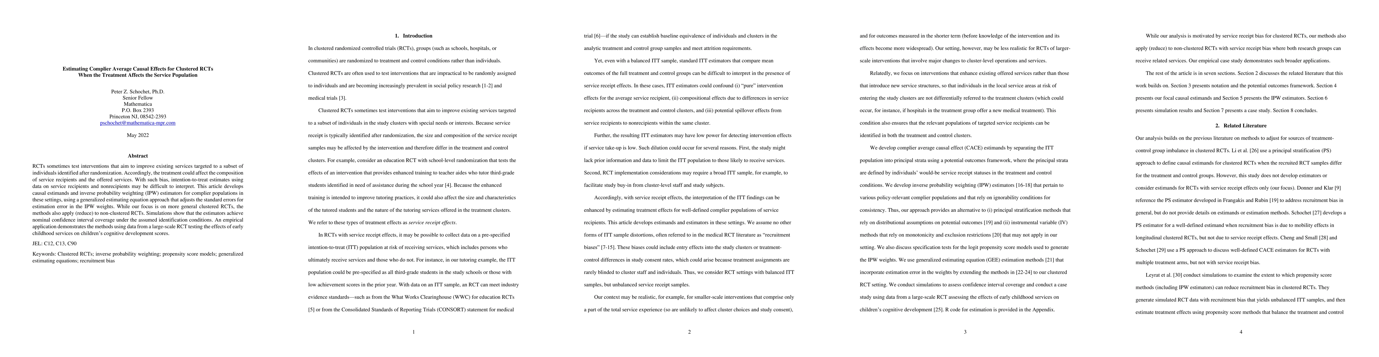 This paper develops causal estimands and inverse probability weighting estimators for complier populations in clustered RCTs where treatments affect service populations. The proposed generalized estimating equation approach adjusts for estimation error in weights, and simulations confirm the method's accuracy under specified conditions.