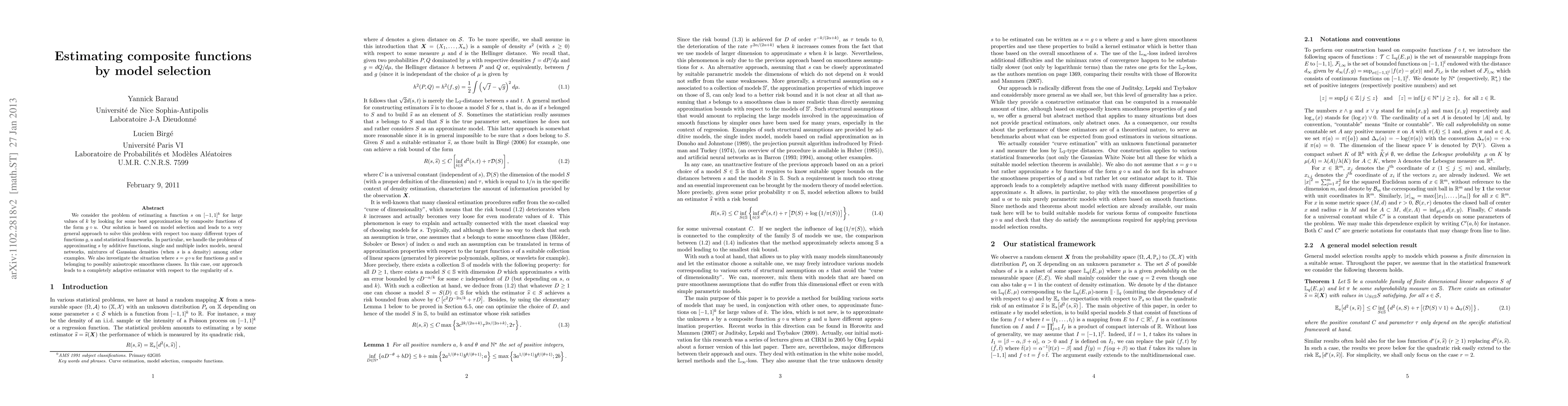 We consider the problem of estimating a function $s$ on $[-1,1]^{k}$ for large values of $k$ by looking for some best approximation by composite functions of the form $g\circ u$. Our solution is based on model selection and leads to a very general approach to solve this problem with respect to many different types of functions $g,u$ and statistical frameworks. In particular, we handle the problems of approximating $s$ by additive functions, single and multiple index models, neural networks, mixtures of Gaussian densities (when $s$ is a density) among other examples. We also investigate the situation where $s=g\circ u$ for functions $g$ and $u$ belonging to possibly anisotropic smoothness classes. In this case, our approach leads to a completely adaptive estimator with respect to the regularity of $s$.