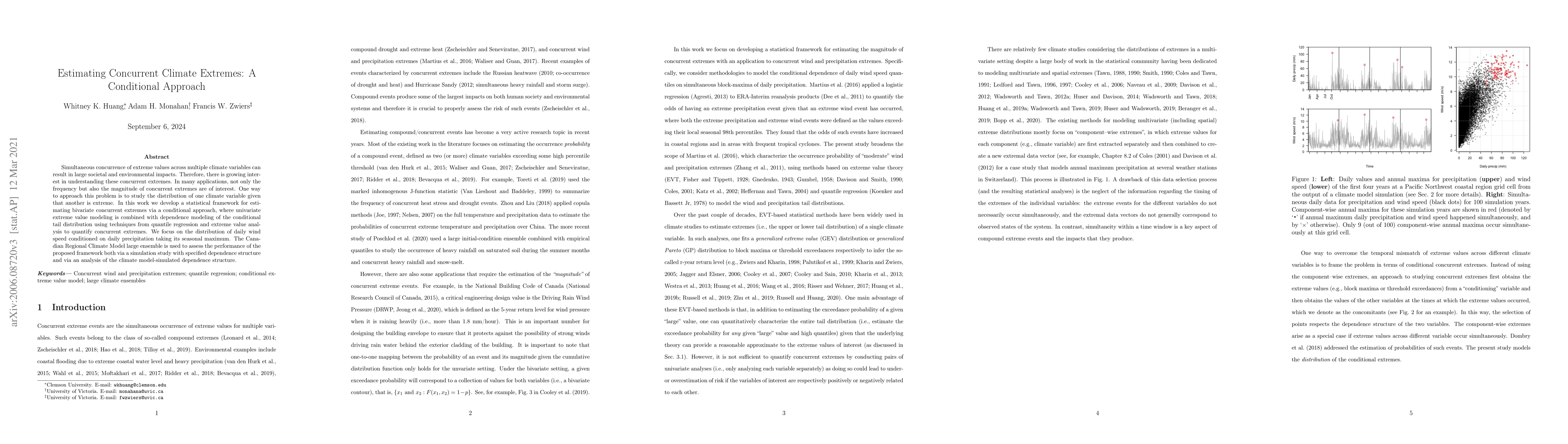 This paper develops a statistical framework for estimating concurrent extremes in climate variables, specifically focusing on daily wind speed conditioned on extreme daily precipitation. The approach combines univariate extreme value modeling with quantile regression and extreme value analysis to assess the dependence structure, using the Canadian Regional Climate Model for validation.