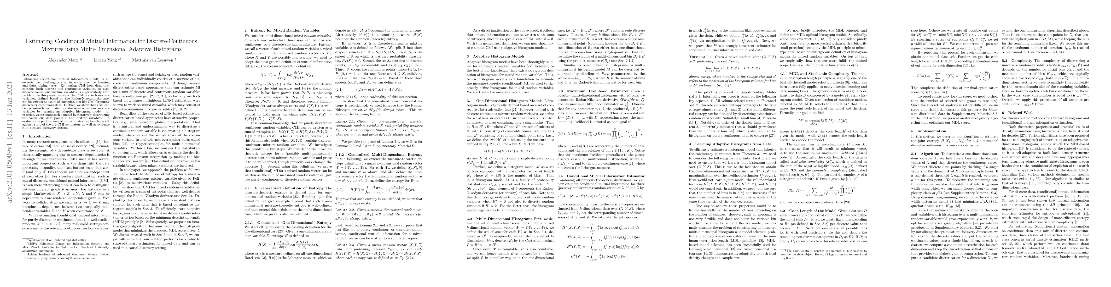 This paper proposes a method to estimate conditional mutual information (CMI) for discrete-continuous mixture variables using adaptive histograms. It demonstrates that CMI for mixed data can be decomposed into a sum of entropies, and introduces an iterative discretization approach to consistently estimate CMI, which is then benchmarked against other CMI estimators and applied in causal discovery.