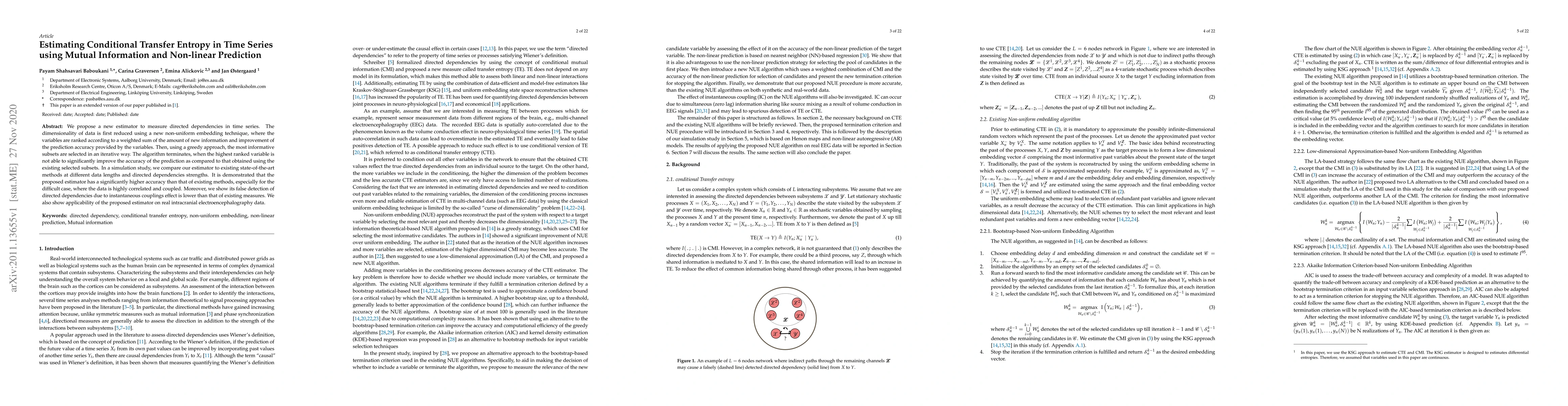 We propose a new estimator to measure directed dependencies in time series. The dimensionality of data is first reduced using a new non-uniform embedding technique, where the variables are ranked according to a weighted sum of the amount of new information and improvement of the prediction accuracy provided by the variables. Then, using a greedy approach, the most informative subsets are selected in an iterative way. The algorithm terminates, when the highest ranked variable is not able to significantly improve the accuracy of the prediction as compared to that obtained using the existing selected subsets. In a simulation study, we compare our estimator to existing state-of-the-art methods at different data lengths and directed dependencies strengths. It is demonstrated that the proposed estimator has a significantly higher accuracy than that of existing methods, especially for the difficult case, where the data is highly correlated and coupled. Moreover, we show its false detection of directed dependencies due to instantaneous couplings effect is lower than that of existing measures. We also show applicability of the proposed estimator on real intracranial electroencephalography data.