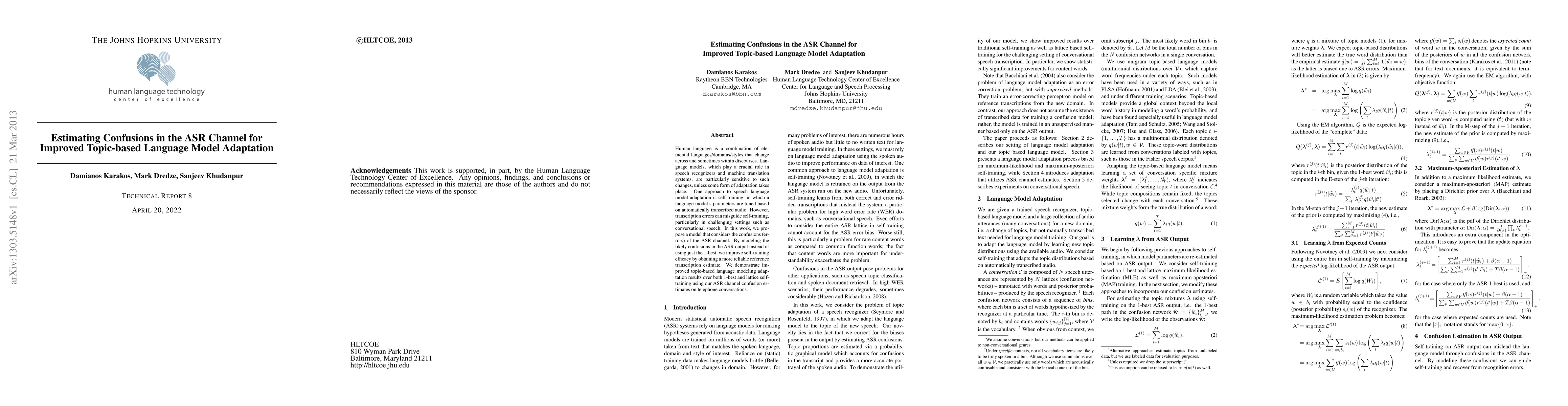 The paper proposes a model that considers the confusions (errors) of the ASR channel for improved topic-based language model adaptation. It introduces an approach to self-training that uses ASR channel confusion estimates instead of just the 1-best, thereby providing a more reliable reference transcription estimate.