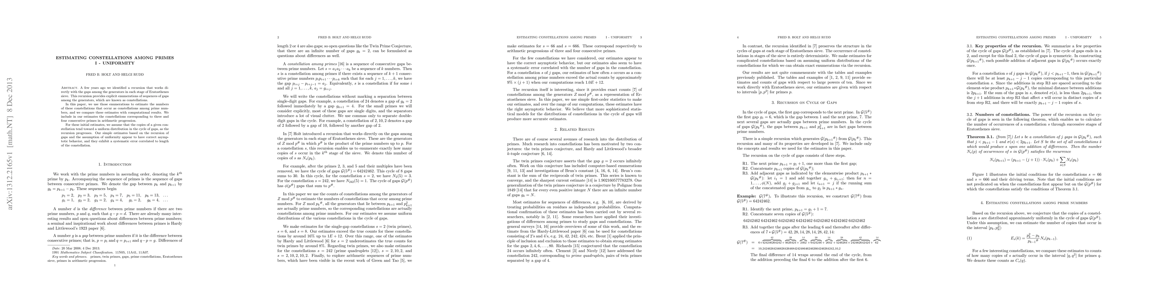 This paper estimates the occurrence of constellations among prime numbers using a recursion based on the gaps in the Eratosthenes sieve, assuming uniformity in distribution. Initial estimates show correct asymptotic behavior but exhibit a systematic error related to constellation length.