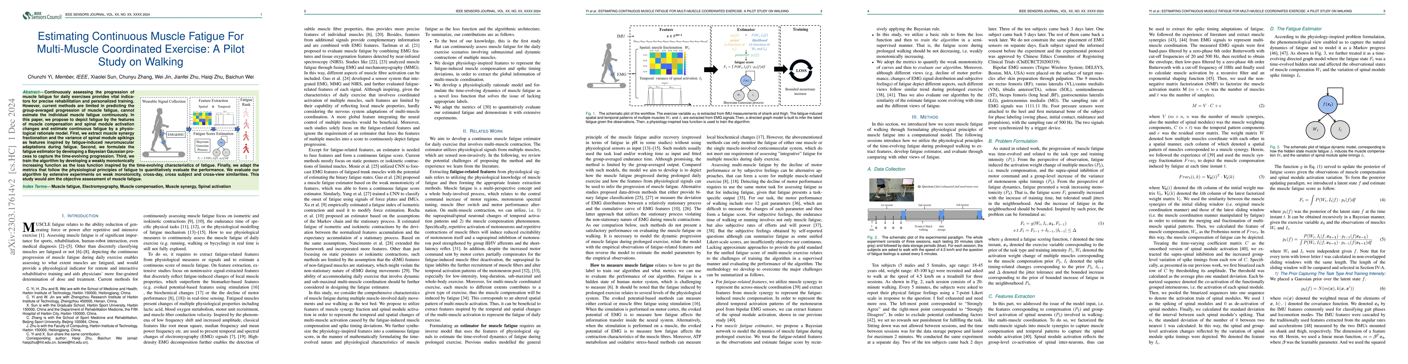 This paper proposes a method to estimate continuous muscle fatigue during multi-muscle coordinated exercises using neuromuscular features and a Bayesian Gaussian process model. The study introduces muscle compensation and spinal module activation changes as fatigue indicators and evaluates the model's performance, showing high similarity and monotonicity compared to other methods.