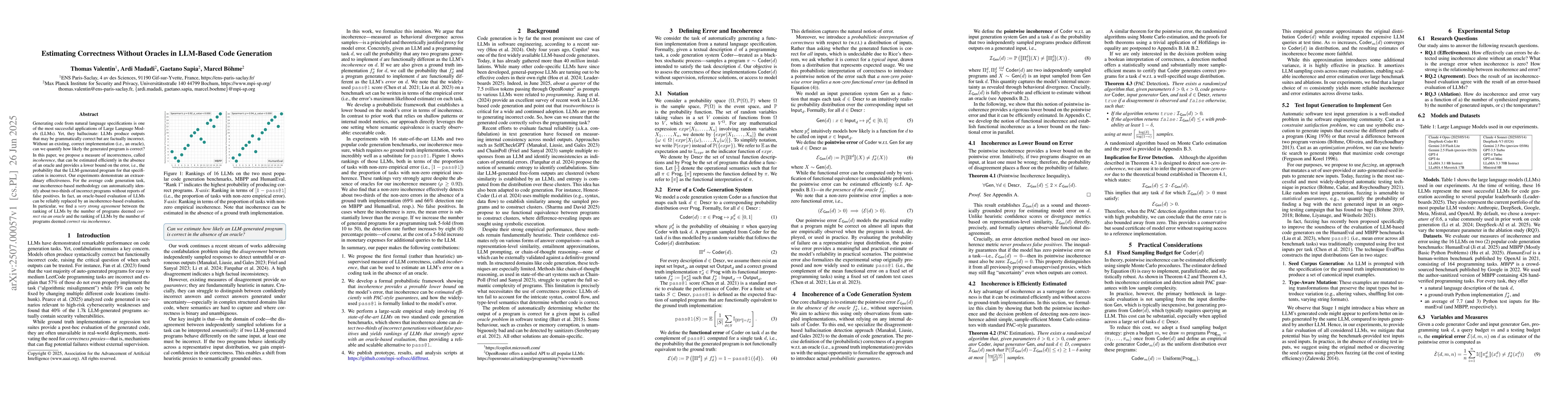 Generating code from natural language specifications is one of the most successful applications of Large Language Models (LLMs). Yet, they hallucinate: LLMs produce outputs that may be grammatically correct but are factually incorrect. Without an existing, correct implementation (i.e., an oracle), can we quantify how likely the generated program is correct? In this paper, we propose a measure of incorrectness, called incoherence, that can be estimated efficiently in the absence of an oracle and provides a lower bound on the error, i.e., the probability that the LLM-generated program for that specification is incorrect. Our experiments demonstrate an extraordinary effectiveness. For the average code generation task, our incoherence-based methodology can automatically identify about two-thirds of incorrect programs without reports of false positives. In fact, an oracle-based evaluation of LLMs can be reliably replaced by an incoherence-based evaluation. In particular, we find a very strong agreement between the ranking of LLMs by the number of programs deemed correct via an oracle (pass@1) and the ranking of LLMs by the number of programs deemed correct via our incoherence.