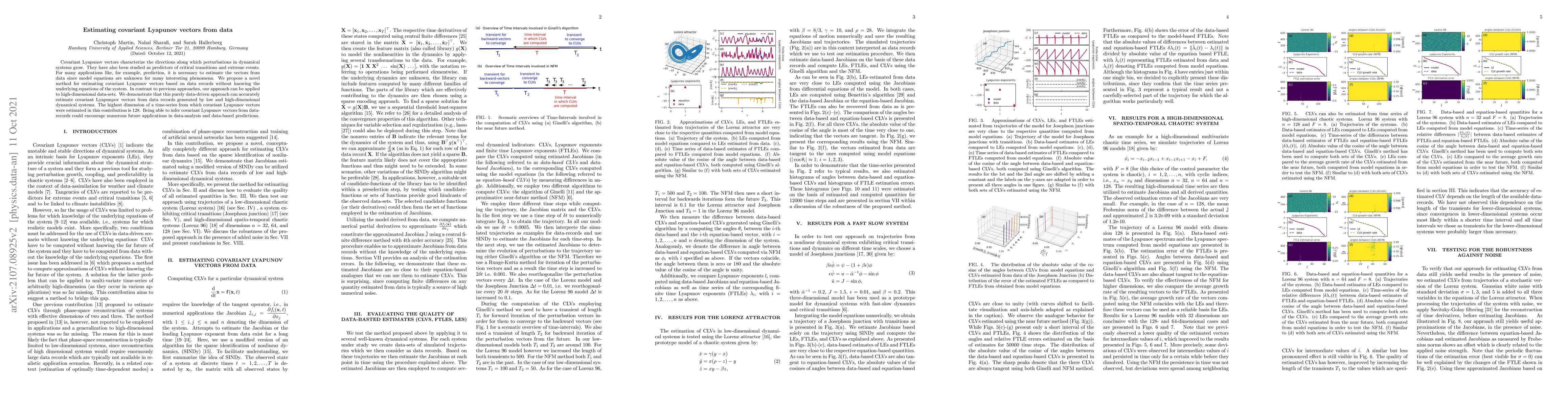 This paper proposes a novel method for estimating covariant Lyapunov vectors from data records without needing the underlying system equations, demonstrating the technique's accuracy on both low and high-dimensional time-series, with a maximum dimension of 128. This data-driven approach opens up new possibilities for applications in data-analysis and prediction.
