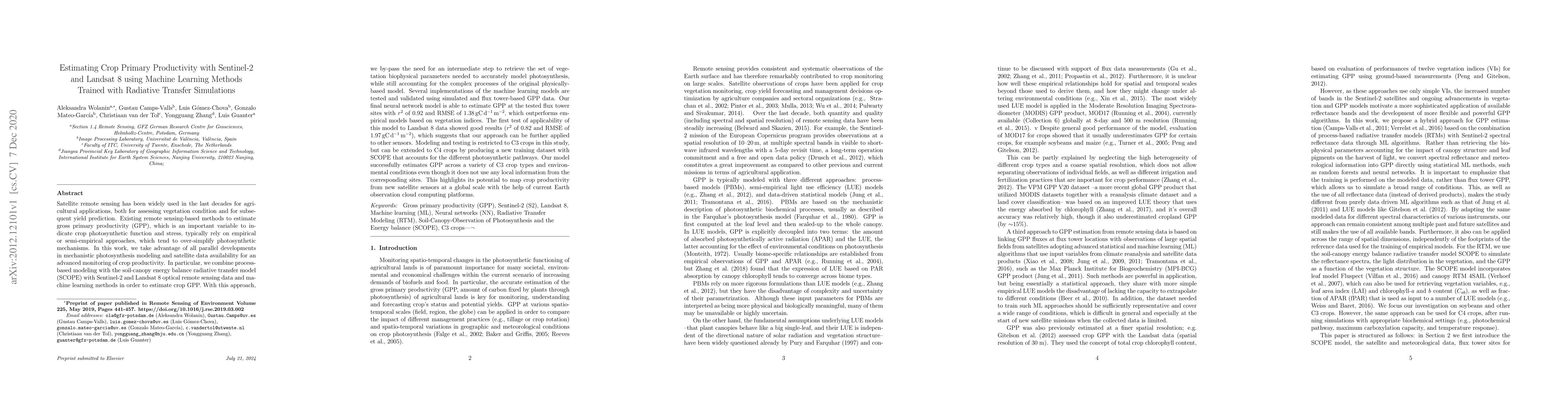 Satellite remote sensing has been widely used in the last decades for agricultural applications, {both for assessing vegetation condition and for subsequent yield prediction.} Existing remote sensing-based methods to estimate gross primary productivity (GPP), which is an important variable to indicate crop photosynthetic function and stress, typically rely on empirical or semi-empirical approaches, which tend to over-simplify photosynthetic mechanisms. In this work, we take advantage of all parallel developments in mechanistic photosynthesis modeling and satellite data availability for advanced monitoring of crop productivity. In particular, we combine process-based modeling with the soil-canopy energy balance radiative transfer model (SCOPE) with Sentinel-2 {and Landsat 8} optical remote sensing data and machine learning methods in order to estimate crop GPP. Our model successfully estimates GPP across a variety of C3 crop types and environmental conditions even though it does not use any local information from the corresponding sites. This highlights its potential to map crop productivity from new satellite sensors at a global scale with the help of current Earth observation cloud computing platforms.