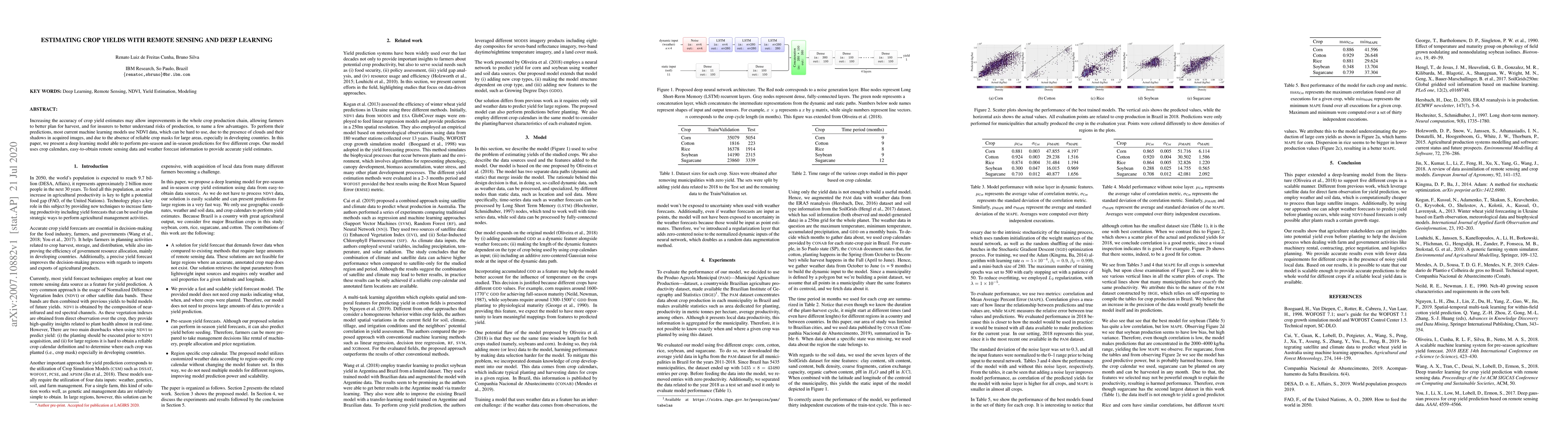 Increasing the accuracy of crop yield estimates may allow improvements in the whole crop production chain, allowing farmers to better plan for harvest, and for insurers to better understand risks of production, to name a few advantages. To perform their predictions, most current machine learning models use NDVI data, which can be hard to use, due to the presence of clouds and their shadows in acquired images, and due to the absence of reliable crop masks for large areas, especially in developing countries. In this paper, we present a deep learning model able to perform pre-season and in-season predictions for five different crops. Our model uses crop calendars, easy-to-obtain remote sensing data and weather forecast information to provide accurate yield estimates.