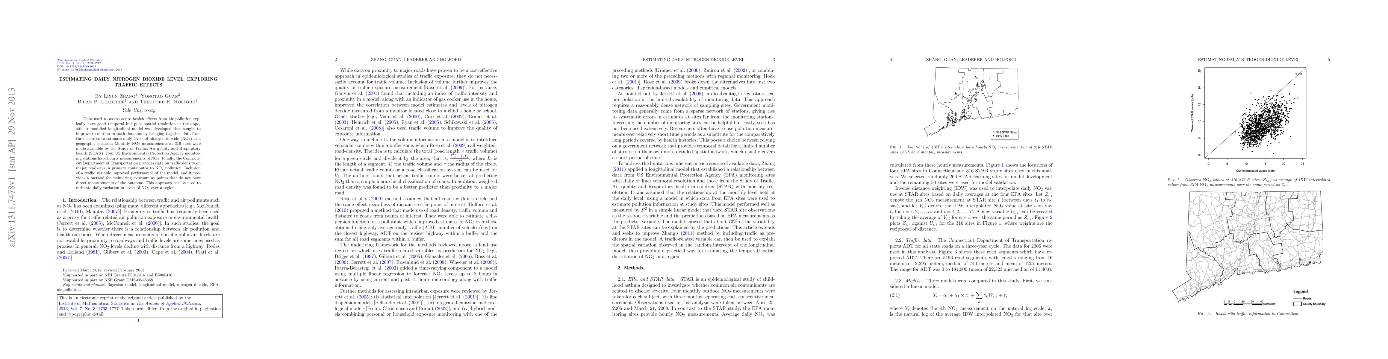 Data used to assess acute health effects from air pollution typically have good temporal but poor spatial resolution or the opposite. A modified longitudinal model was developed that sought to improve resolution in both domains by bringing together data from three sources to estimate daily levels of nitrogen dioxide ($\mathrm {NO}_2$) at a geographic location. Monthly $\mathrm {NO}_2$ measurements at 316 sites were made available by the Study of Traffic, Air quality and Respiratory health (STAR). Four US Environmental Protection Agency monitoring stations have hourly measurements of $\mathrm {NO}_2$. Finally, the Connecticut Department of Transportation provides data on traffic density on major roadways, a primary contributor to $\mathrm {NO}_2$ pollution. Inclusion of a traffic variable improved performance of the model, and it provides a method for estimating exposure at points that do not have direct measurements of the outcome. This approach can be used to estimate daily variation in levels of $\mathrm {NO}_2$ over a region.