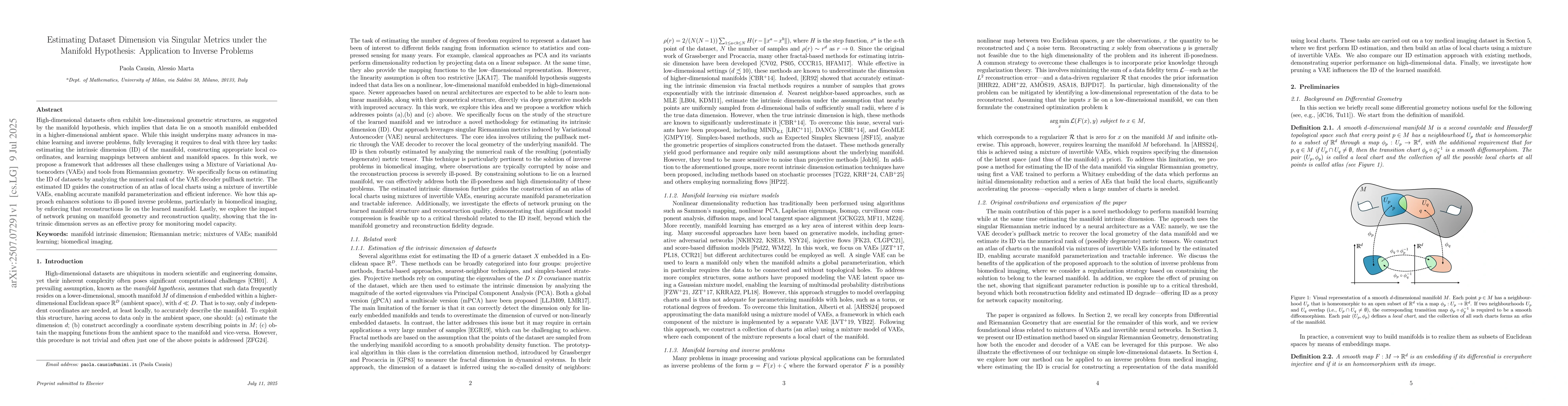 High-dimensional datasets often exhibit low-dimensional geometric structures, as suggested by the manifold hypothesis, which implies that data lie on a smooth manifold embedded in a higher-dimensional ambient space. While this insight underpins many advances in machine learning and inverse problems, fully leveraging it requires to deal with three key tasks: estimating the intrinsic dimension (ID) of the manifold, constructing appropriate local coordinates, and learning mappings between ambient and manifold spaces. In this work, we propose a framework that addresses all these challenges using a Mixture of Variational Autoencoders (VAEs) and tools from Riemannian geometry. We specifically focus on estimating the ID of datasets by analyzing the numerical rank of the VAE decoder pullback metric. The estimated ID guides the construction of an atlas of local charts using a mixture of invertible VAEs, enabling accurate manifold parameterization and efficient inference. We how this approach enhances solutions to ill-posed inverse problems, particularly in biomedical imaging, by enforcing that reconstructions lie on the learned manifold. Lastly, we explore the impact of network pruning on manifold geometry and reconstruction quality, showing that the intrinsic dimension serves as an effective proxy for monitoring model capacity.
