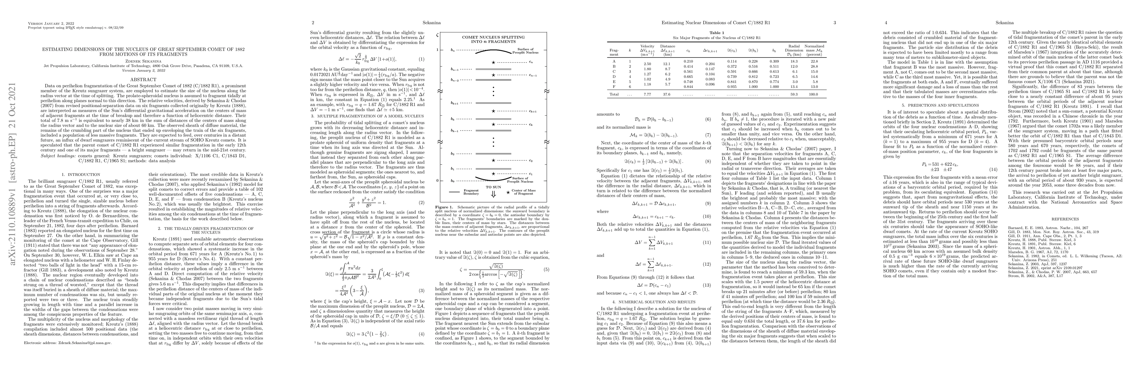 Data on perihelion fragmentation of the Great September Comet of 1882 (C/1882 R1), a prominent member of the Kreutz sungrazer system, are employed to estimate the size of the nucleus along the radius vector at the time of splitting. The prolate-spheroidal nucleus is assumed to fragment tidally at perihelion along planes normal to this direction. The relative velocities, derived by Sekanina & Chodas (2007) from revised positional-separation data on six fragments collected originally by Kreutz (1888) are interpreted as measures of the Sun's differential gravitational acceleration on the centers of mass of adjacent fragments at the time of breakup and therefore a function of heliocentric distance. Their total of 7.8 m/s is equivalent to nearly 38 km in the sum of distances of the centers of mass along the radius vector and to the nuclear size of about 60 km. The observed sheath of diffuse material, the remains of the crumbling part of the nucleus that ended up enveloping the train of the six fragments, included a population of less massive fragments. They are expected to feed, over centuries in a distant future, an influx of dwarf sungrazers reminiscent of the current stream of SOHO Kreutz comets. It is speculated that the parent comet of C/1882 R1 experienced similar fragmentation in the early 12th century and one of its major fragments -- a bright sungrazer -- may return in the mid-21st century.
