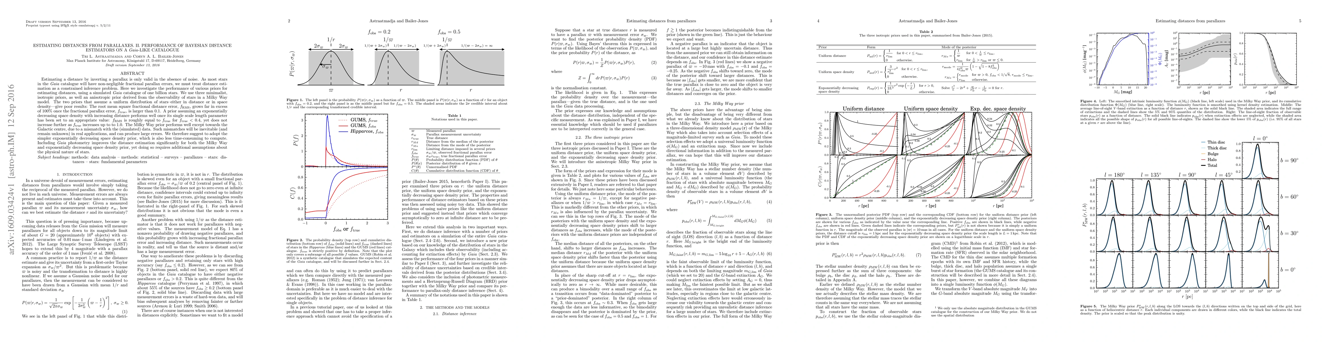Researchers tested Bayesian distance estimators on a simulated Gaia catalogue to find that an exponential space density prior performs well for distance estimates, but may produce large errors towards the Galactic centre. Including photometry data improves accuracy significantly.