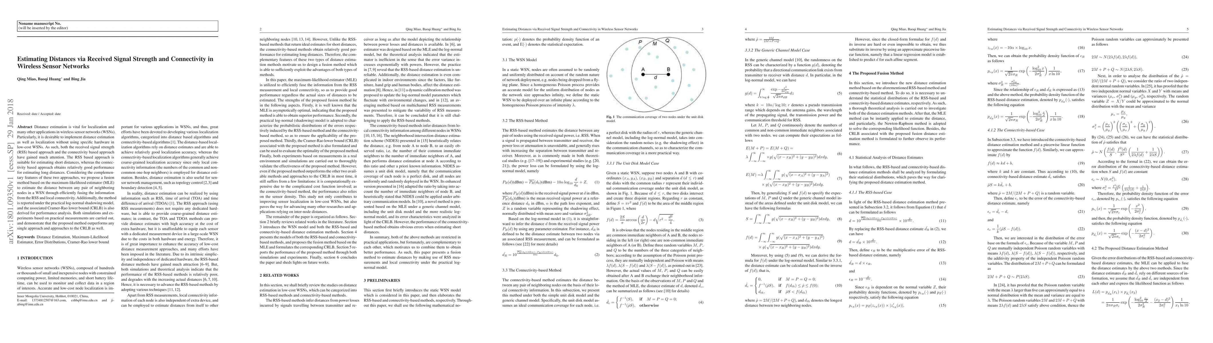 This paper proposes a fusion method using the maximum-likelihood estimator to combine received signal strength and connectivity information for distance estimation in wireless sensor networks, achieving better performance than either approach alone and approaching the Cramer-Rao lower bound. The method is validated through simulations and practical measurements.