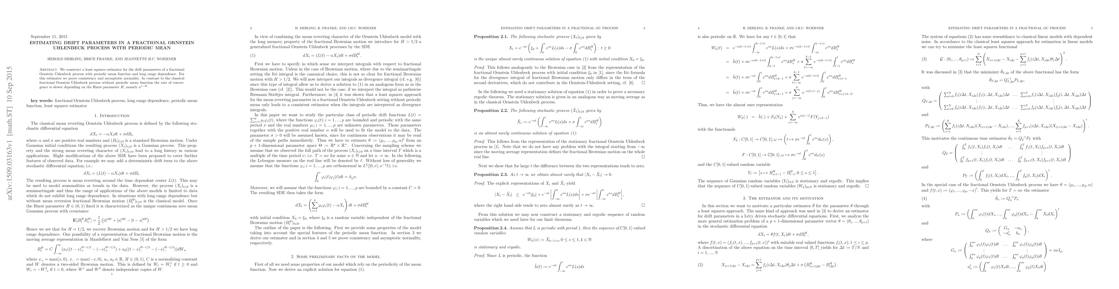 This paper develops a least squares estimator for drift parameters in a fractional Ornstein Uhlenbeck process featuring a periodic mean function and long-range dependence. It demonstrates the estimator's consistency and asymptotic normality, noting a slower convergence rate of $n^{1-H}$ influenced by the Hurst parameter $H$.
