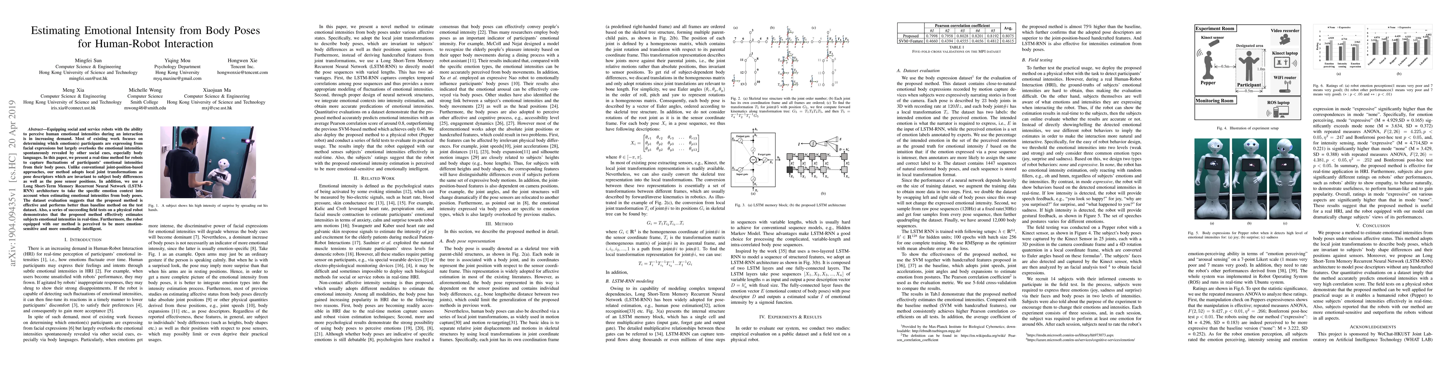Equipping social and service robots with the ability to perceive human emotional intensities during an interaction is in increasing demand. Most of existing work focuses on determining which emotion(s) participants are expressing from facial expressions but largely overlooks the emotional intensities spontaneously revealed by other social cues, especially body languages. In this paper, we present a real-time method for robots to capture fluctuations of participants' emotional intensities from their body poses. Unlike conventional joint-position-based approaches, our method adopts local joint transformations as pose descriptors which are invariant to subject body differences as well as the pose sensor positions. In addition, we use a Long Short-Term Memory Recurrent Neural Network (LSTM-RNN) architecture to take the specific emotion context into account when estimating emotional intensities from body poses. The dataset evaluation suggests that the proposed method is effective and performs better than baseline method on the test dataset. Also, a series of succeeding field tests on a physical robot demonstrates that the proposed method effectively estimates subjects emotional intensities in real-time. Furthermore, the robot equipped with our method is perceived to be more emotion-sensitive and more emotionally intelligent.