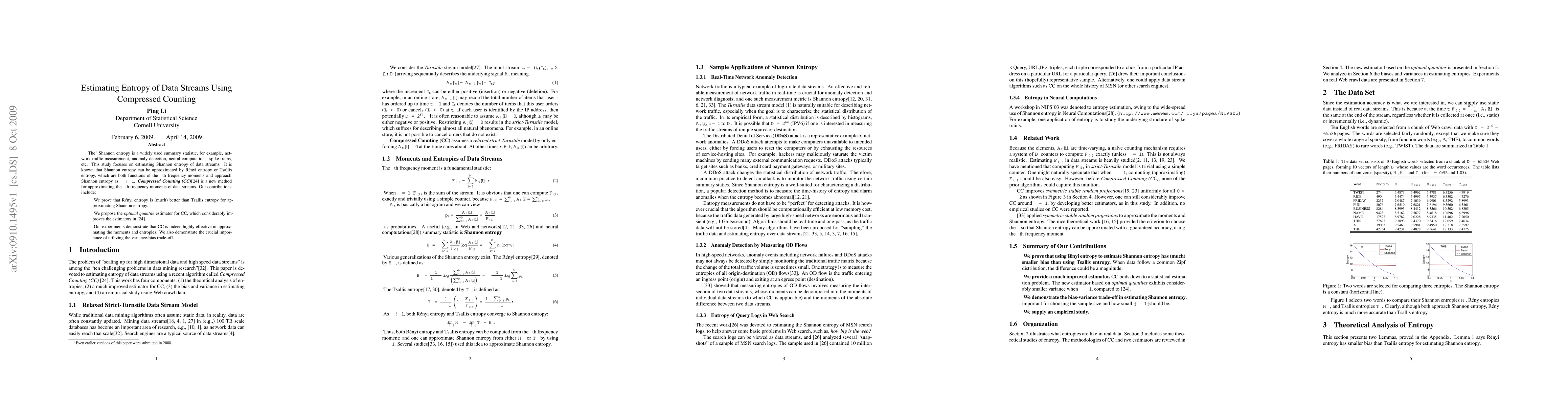 This research introduces Compressed Counting (CC) to estimate Shannon entropy in data streams by approximating p-th frequency moments. The study finds Renyi entropy superior to Tsallis entropy for this task and proposes an optimal quantile estimator for CC, showing its effectiveness through experiments emphasizing the importance of the variance-bias trade-off.