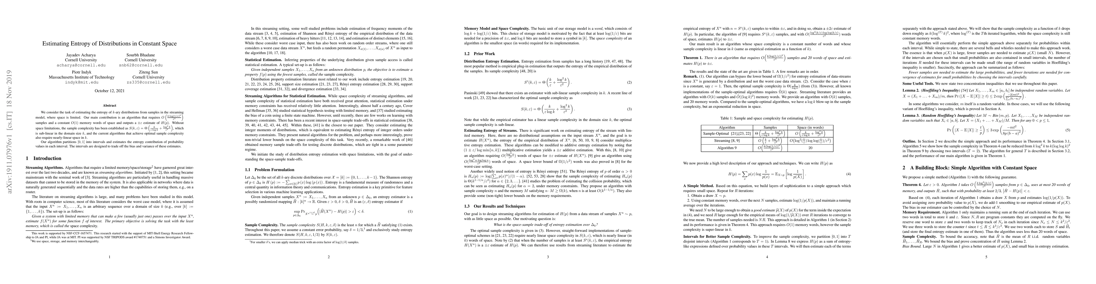 We consider the task of estimating the entropy of $k$-ary distributions from samples in the streaming model, where space is limited. Our main contribution is an algorithm that requires $O\left(\frac{k \log (1/\varepsilon)^2}{\varepsilon^3}\right)$ samples and a constant $O(1)$ memory words of space and outputs a $\pm\varepsilon$ estimate of $H(p)$. Without space limitations, the sample complexity has been established as $S(k,\varepsilon)=\Theta\left(\frac k{\varepsilon\log k}+\frac{\log^2 k}{\varepsilon^2}\right)$, which is sub-linear in the domain size $k$, and the current algorithms that achieve optimal sample complexity also require nearly-linear space in $k$. Our algorithm partitions $[0,1]$ into intervals and estimates the entropy contribution of probability values in each interval. The intervals are designed to trade off the bias and variance of these estimates.