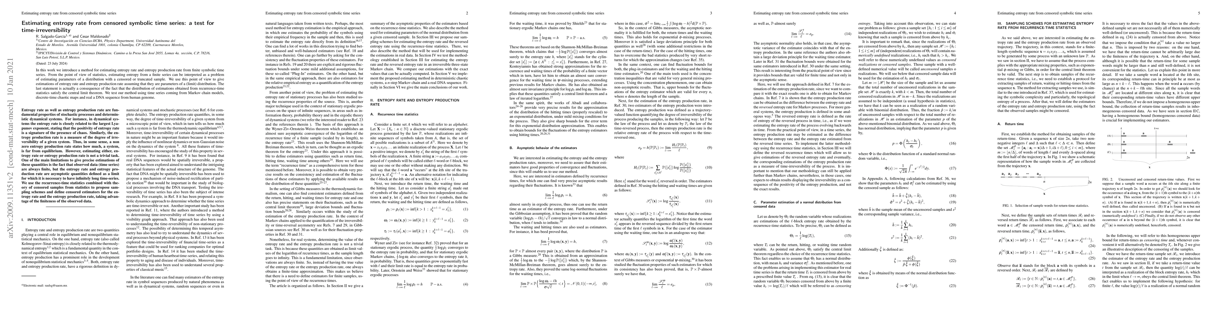 In this work we introduce a method for estimating entropy rate and entropy production rate from finite symbolic time series. From the point of view of statistics, estimating entropy from a finite series can be interpreted as a problem of estimating parameters of a distribution with a censored or truncated sample. We use this point of view to give estimations of entropy rate and entropy production rate assuming that they are parameters of a (limit) distribution. The last statement is actually a consequence of the fact that the distribution of estimations obtained from recurrence-time statistics satisfy the central limit theorem. We test our method using time series coming from Markov chain models, discrete-time chaotic maps and real a DNA sequence from human genome.