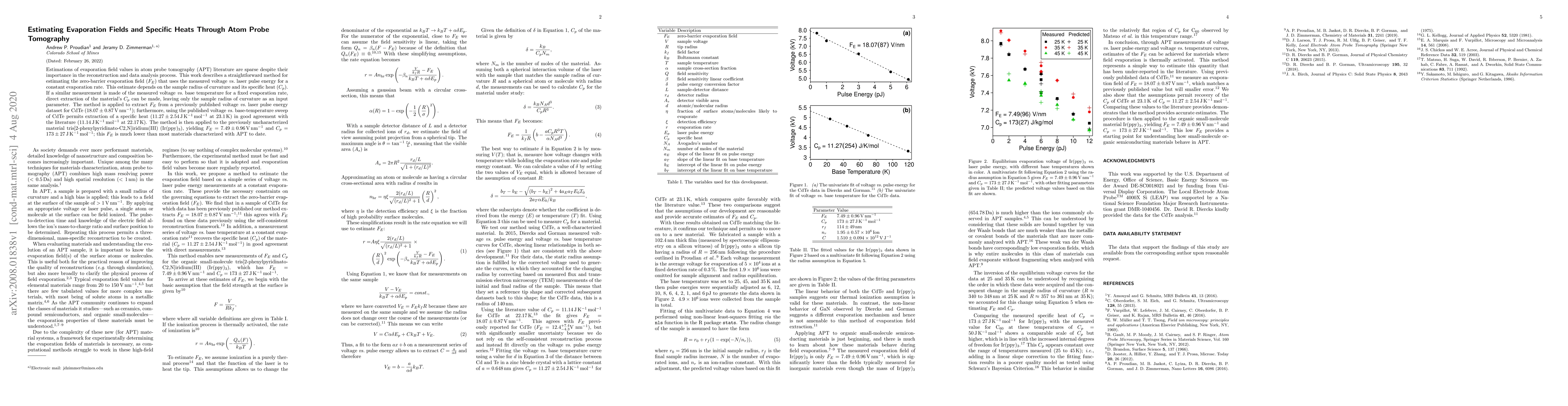 This paper proposes a method to estimate the zero-barrier evaporation field in atom probe tomography using voltage vs. laser pulse energy data, and to extract specific heats via voltage vs. base temperature measurements. The method is validated on CdTe and applied to Ir(ppy)₃, yielding lower evaporation fields than previously characterized materials.