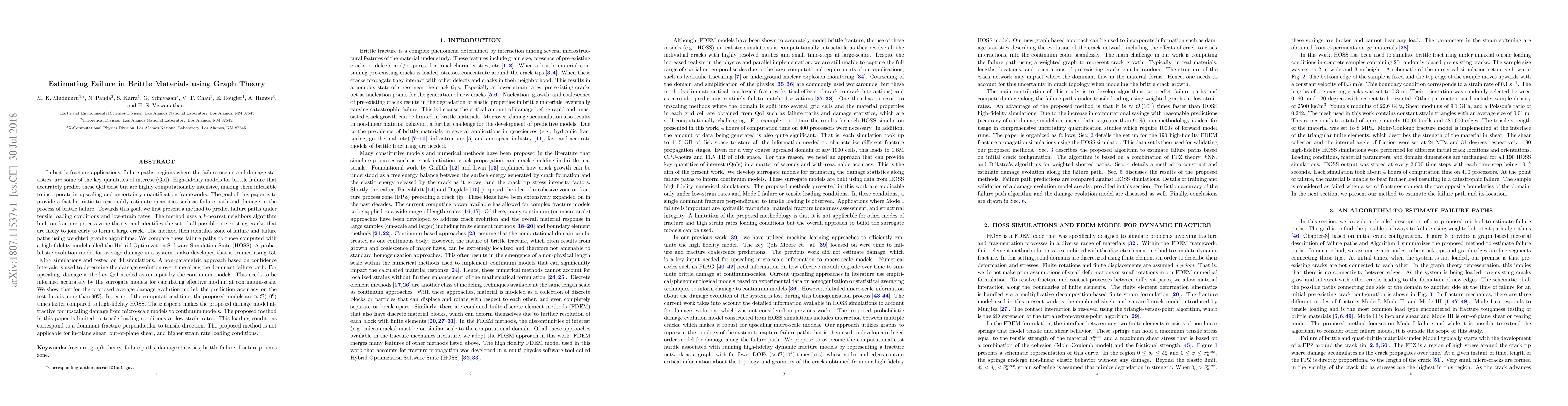 This paper introduces a computationally efficient method using graph theory to estimate failure paths and damage in brittle materials, significantly reducing calculation time compared to high-fidelity models like HOSS, while maintaining over 90% prediction accuracy.