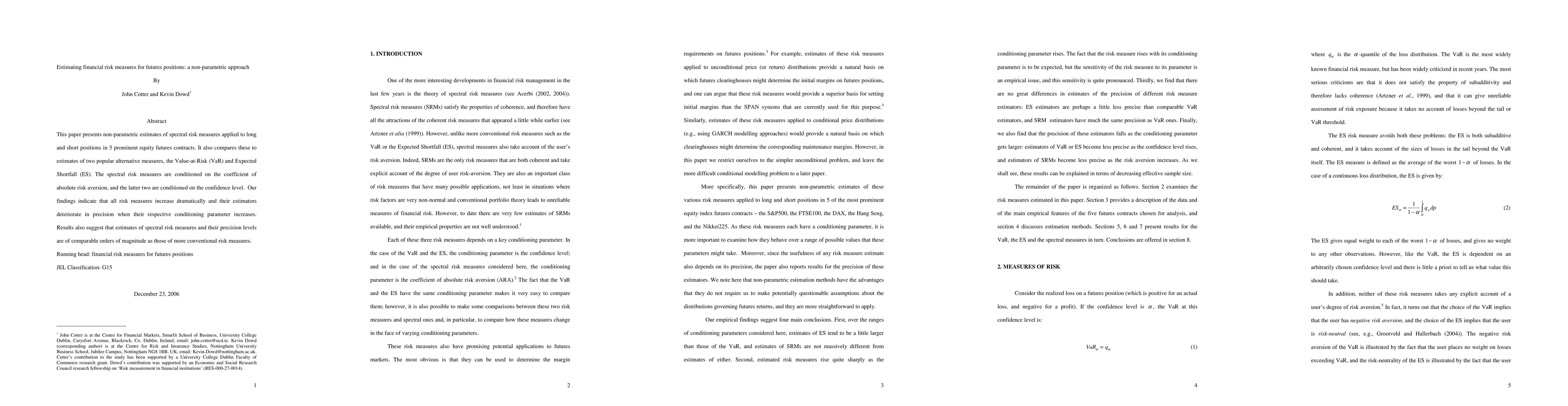 This paper presents non-parametric estimates of spectral risk measures applied to long and short positions in 5 prominent equity futures contracts. It also compares these to estimates of two popular alternative measures, the Value-at-Risk (VaR) and Expected Shortfall (ES). The spectral risk measures are conditioned on the coefficient of absolute risk aversion, and the latter two are conditioned on the confidence level. Our findings indicate that all risk measures increase dramatically and their estimators deteriorate in precision when their respective conditioning parameter increases. Results also suggest that estimates of spectral risk measures and their precision levels are of comparable orders of magnitude as those of more conventional risk measures. Running head: financial risk measures for futures positions