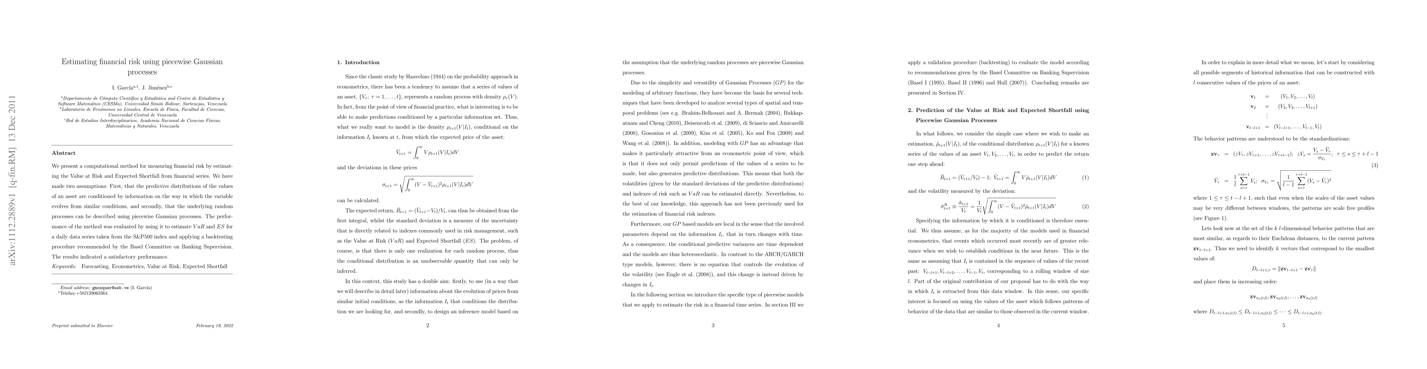 This paper proposes a method for estimating financial risk using piecewise Gaussian processes to predict Value at Risk and Expected Shortfall from financial data.