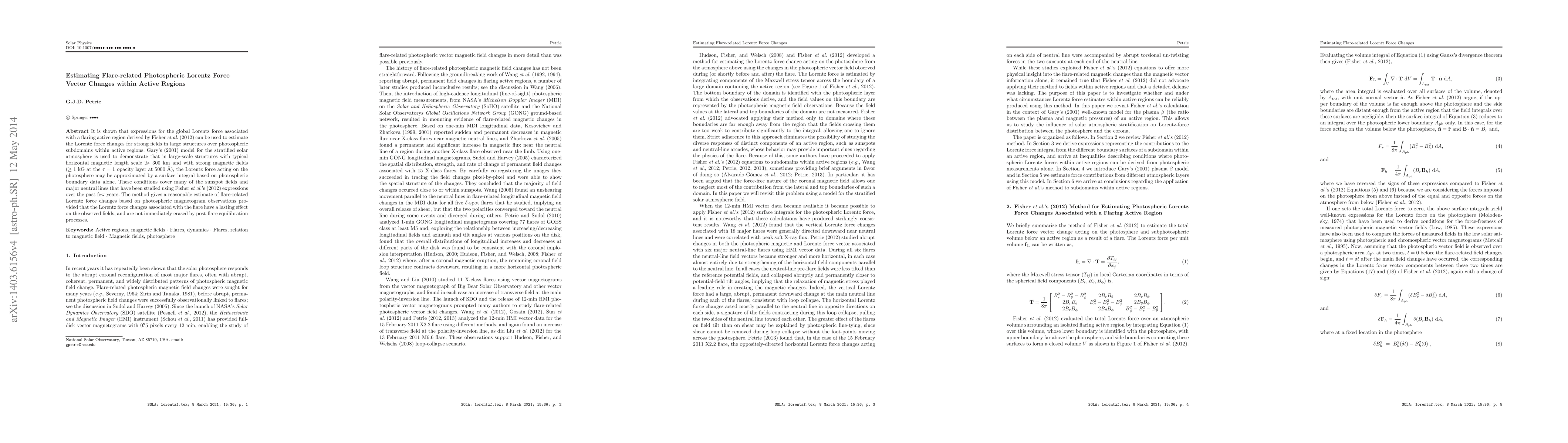 This paper demonstrates that Fisher et al.'s (2012) expressions for global Lorentz force in flaring active regions can estimate changes in large structures over photospheric subdomains. Using Gary's (2001) model, it shows that strong magnetic fields in large-scale structures can be approximated by surface integrals based on photospheric boundary data, providing a reasonable estimate of flare-related Lorentz force changes.