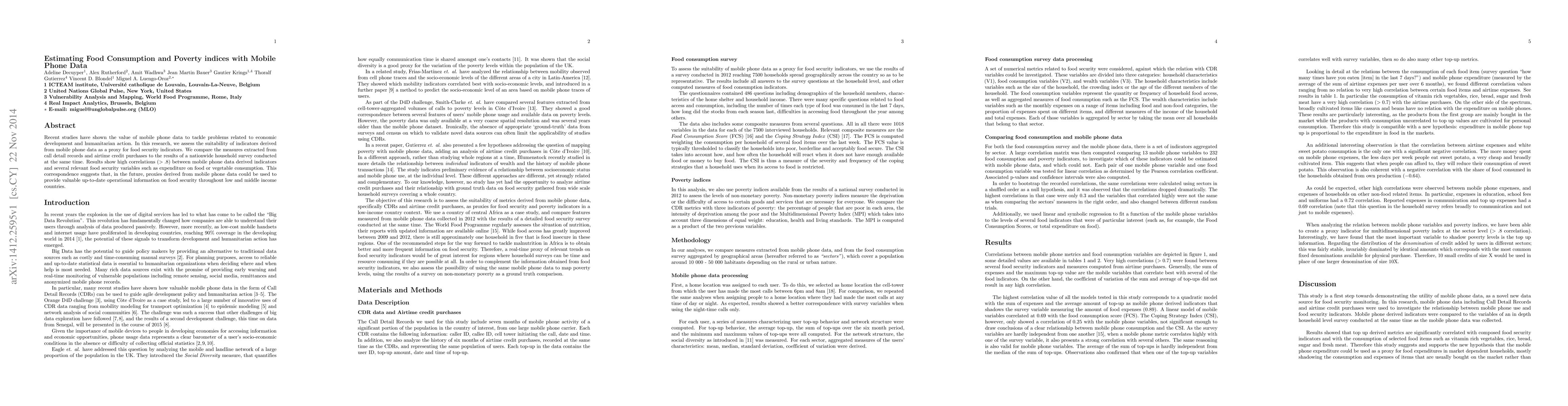This research evaluates mobile phone data as a proxy for food security indicators, finding high correlations (> .8) between mobile phone-derived metrics and food security variables like food expenditure and vegetable consumption. The study suggests mobile phone data could offer timely insights into food security in low and middle-income countries.