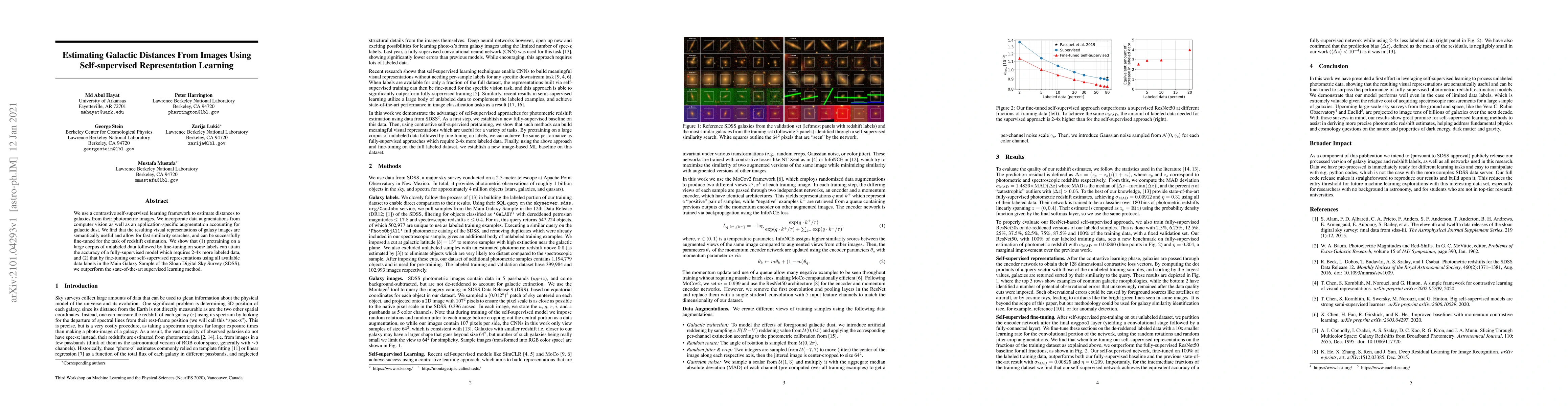 This paper employs self-supervised learning to estimate distances to galaxies from their images, achieving competitive accuracy with less labeled data compared to fully supervised models. The method uses contrastive learning and data augmentations, including a specific augmentation for galactic dust, to generate semantically useful visual representations that enable efficient similarity searches and redshift estimation.