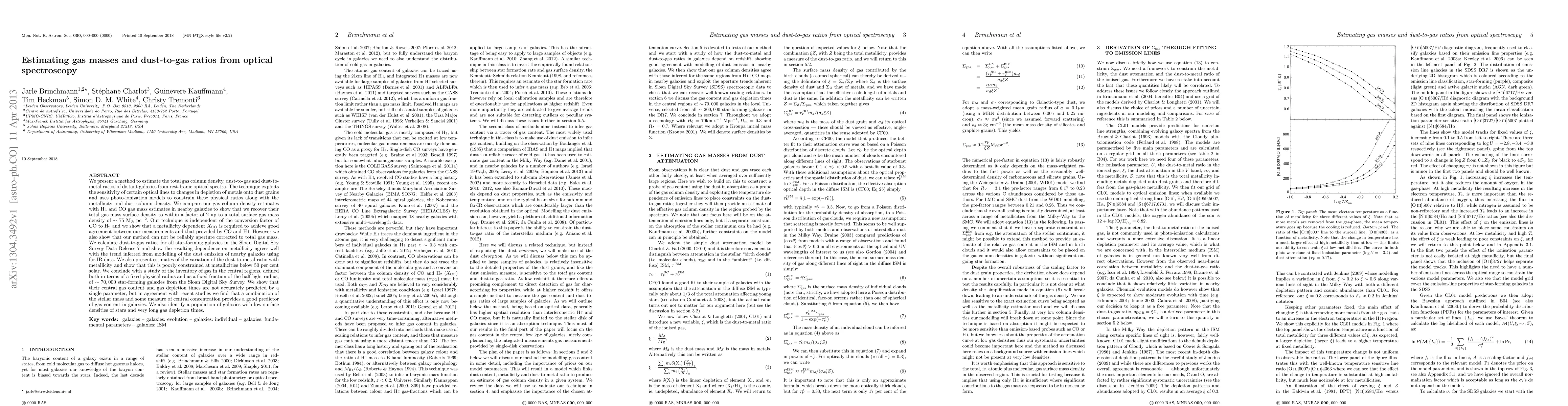 We present a method to estimate the total gas column density, dust-to-gas and dust-to-metal ratios of distant galaxies from rest-frame optical spectra. The technique exploits the sensitivity of certain optical lines to changes in depletion of metals onto dust grains and uses photo-ionization models to constrain these physical ratios along with the metallicity (Z) and dust column density. We compare our gas column density estimates with HI and CO gas mass estimates in nearby galaxies to show that we recover their total gas mass surface density to within a factor of 2 up to a total surface gas mass density of ~75 Mo/pc^2. Our technique is independent of the conversion factor of CO to H2 and we show that a Z-dependent XCO is required to achieve good agreement between our measurements and that provided by CO and HI. However we also show that our method can not be reliably aperture corrected to total gas mass. We calculate dust-to-gas ratios for all star-forming galaxies in the SDSS DR7 and show the resulting dependence on Z agrees well with the trend inferred from modelling of the dust emission of nearby galaxies using FIR data. We also present estimates of the variation of the dust-to-metal ratio with Z and show that this is poorly constrained at Z<~0.5Z_sun. We end with a study of the inventory of gas in the central regions, defined both in terms of a fixed physical radius and as a fixed fraction of the half-light radius, of ~70,000 star-forming galaxies from the Sloan Digital Sky Survey. We show that their central gas content and gas depletion times are not accurately predicted by a single parameter, but in agreement with recent studies we find that a combination of the M* and some measure of central concentration provides a good predictor of gas content in galaxies. We also identify a population of galaxies with low surface densities of stars and very long gas depletion times.