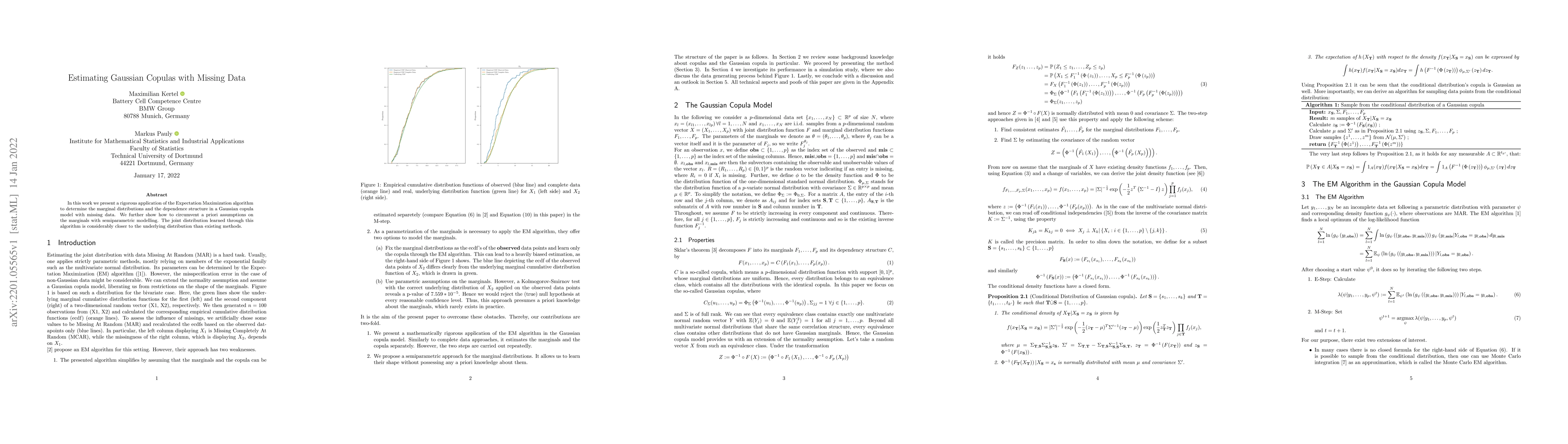 The paper presents a rigorous EM algorithm with Monte Carlo integration for estimating Gaussian copulas with missing data, incorporating semiparametric mixture models for marginal density estimation.