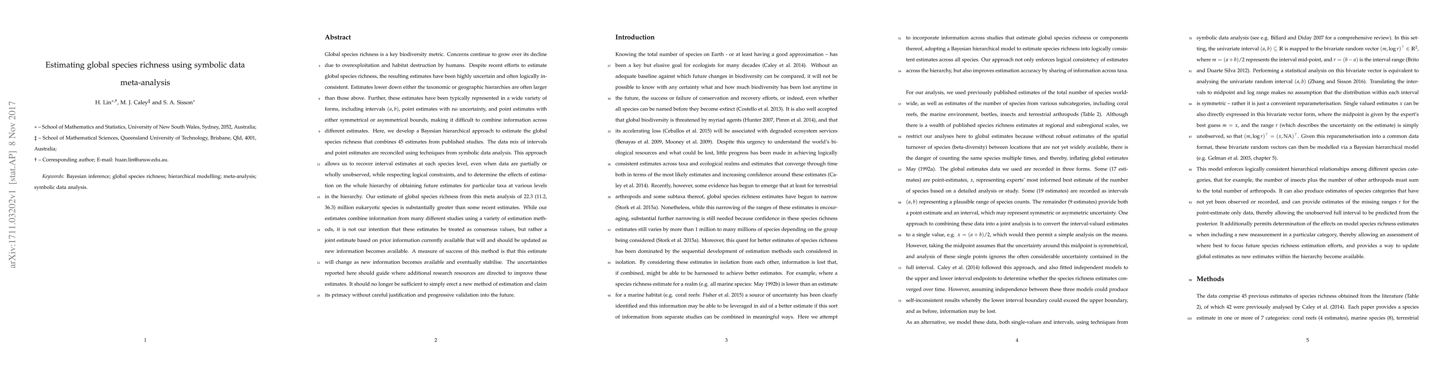 This paper proposes a Bayesian hierarchical method to estimate global species richness by integrating diverse data forms from published studies, aiming to reduce uncertainty and logical inconsistencies in previous estimates. The approach recovers interval estimates at each level of the hierarchy, even with incomplete data, while respecting logical constraints.