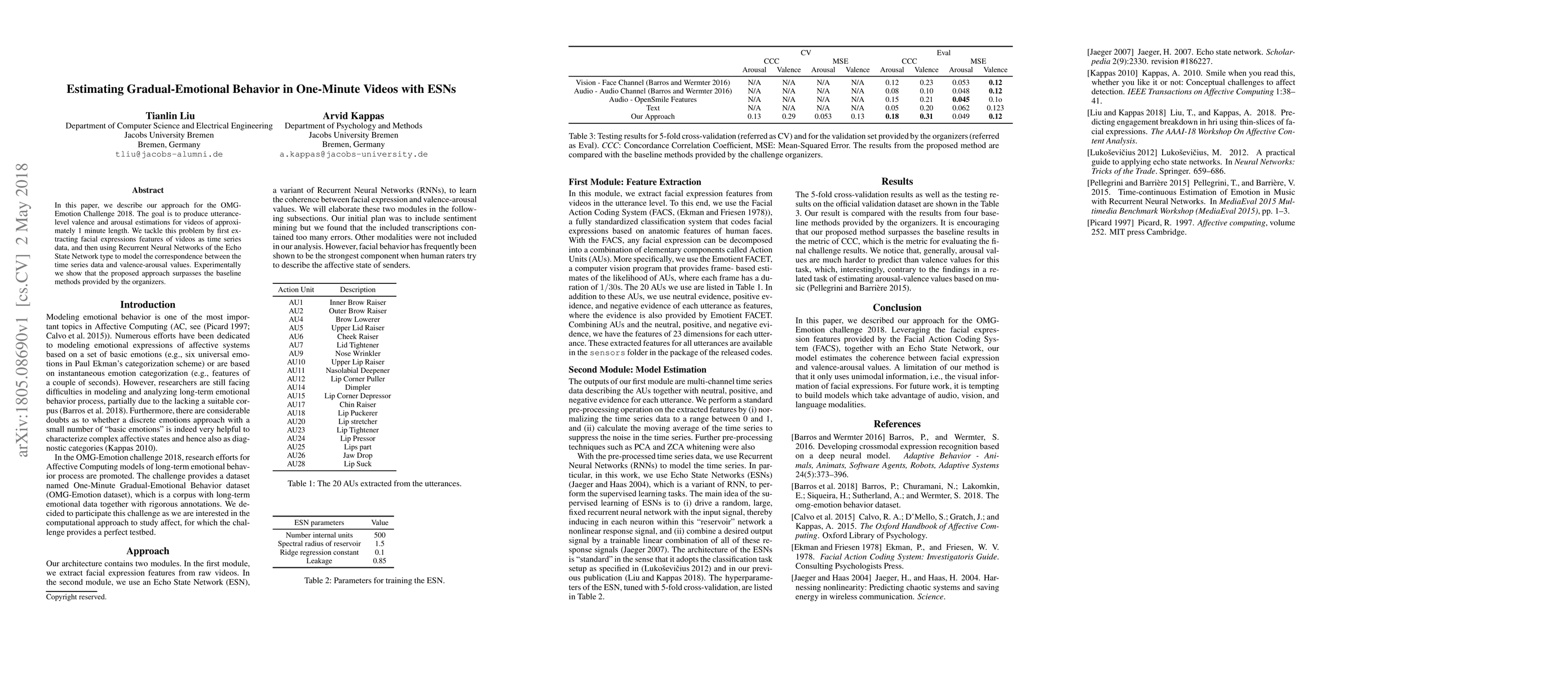 This paper proposes a method using Echo State Networks (ESNs) to estimate valence and arousal in one-minute videos by extracting facial expression features as time series data. The approach outperforms baseline methods in the OMG-Emotion Challenge 2018.